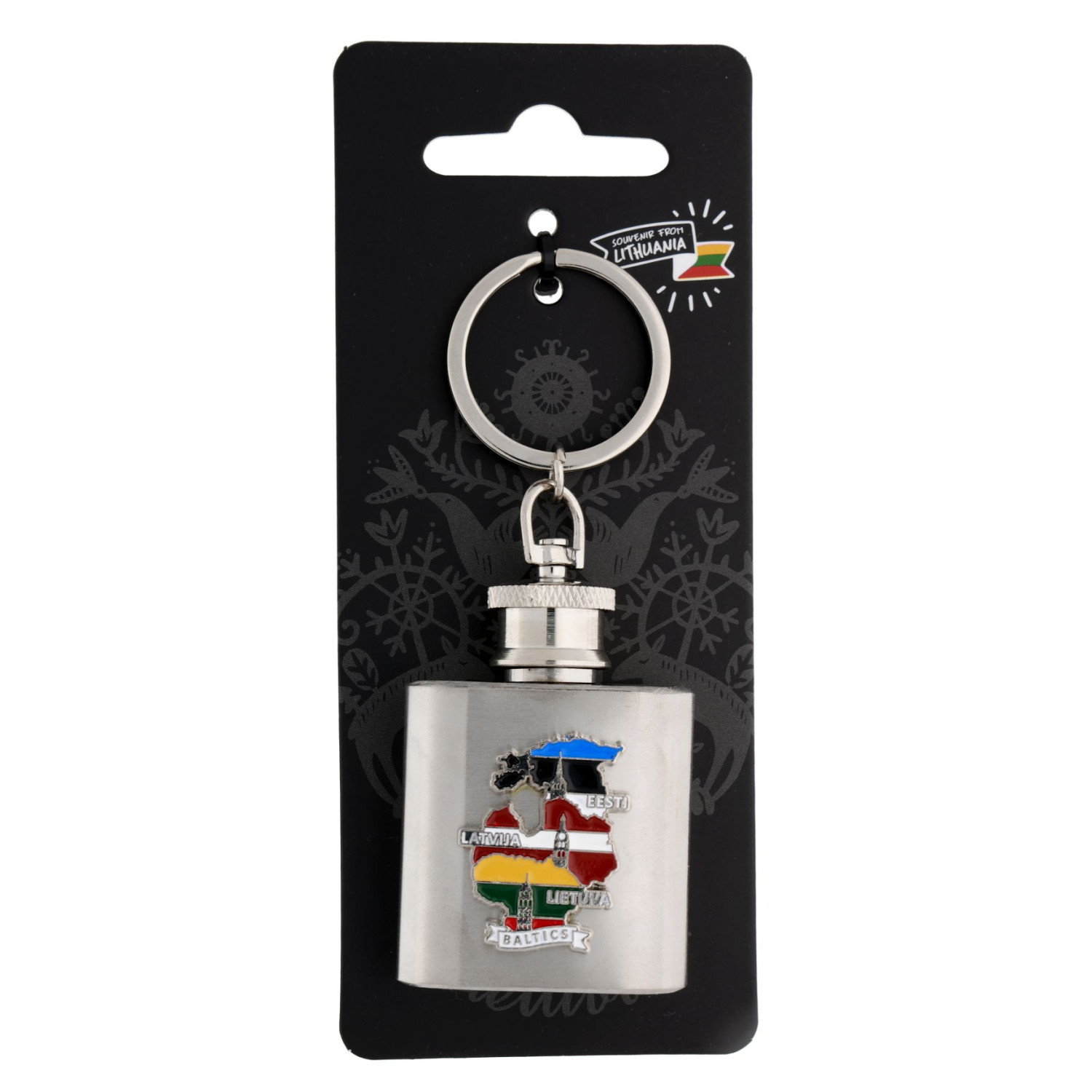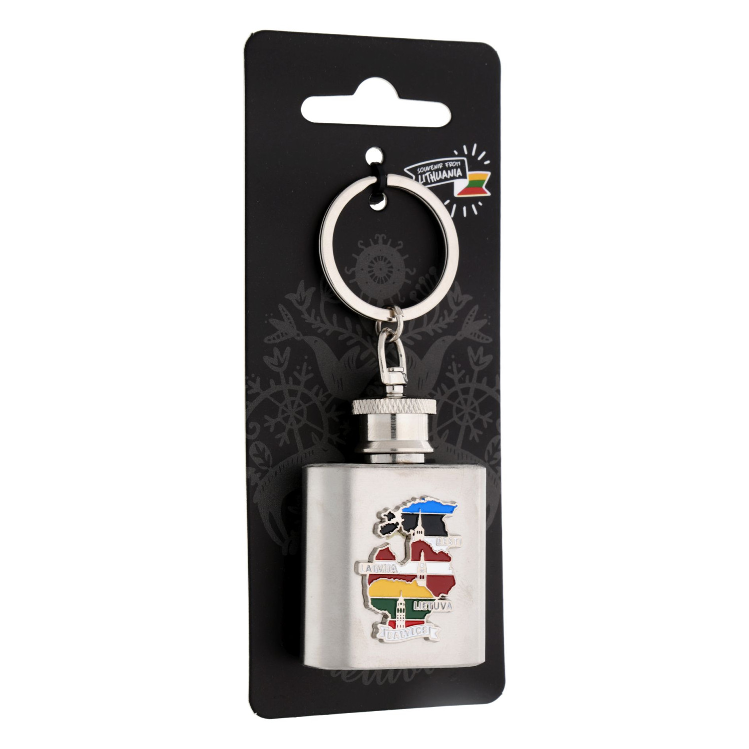 Metāla atslēgu piekariņš pudelītes formā, rotāts ar Baltijas valstu kontūru un to karogu krāsām. Stilīgs un praktisks aksesuārs ikdienai un tirdzniecībai.