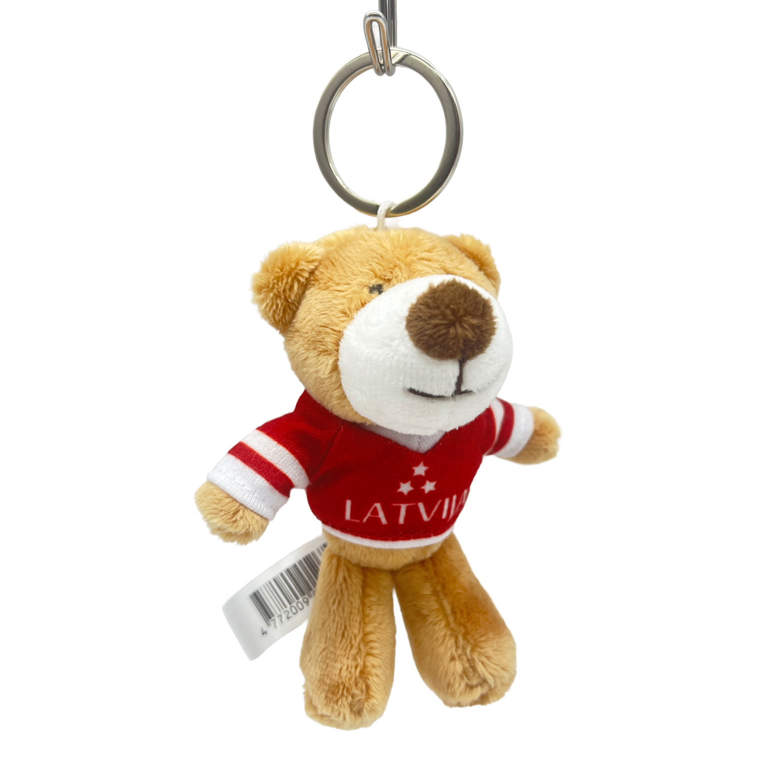 Mīļš un mīksts lāča piekariņš ar Latvijas karoga krāsu kreklu un uzrakstu Latvija — lieliska dāvana vai suvenīrs piemiņai no Latvijas.