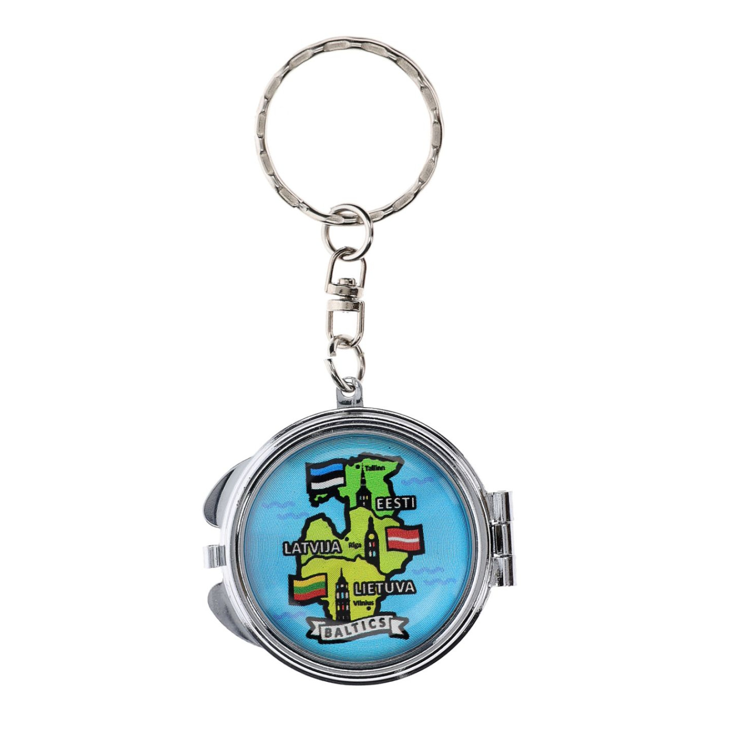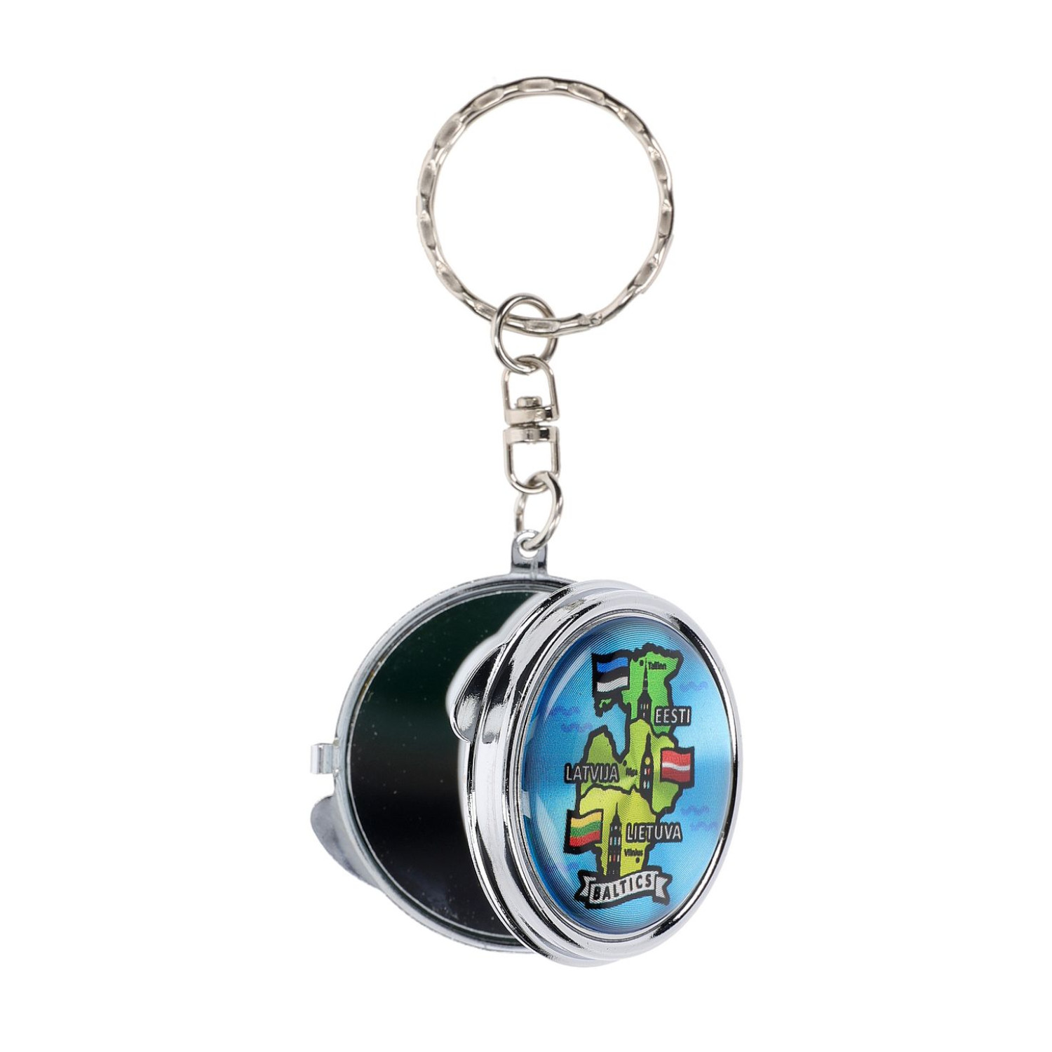 Apaļš metāla atslēgu piekariņš ar iebūvētu spoguli un krāsainu Baltijas valstu – Igaunijas, Latvijas un Lietuvas – karti. Praktisks un kompakts suvenīrs ar valstu karogiem un galvaspilsētu nosaukumiem: Tallina, Rīga un Viļņa.