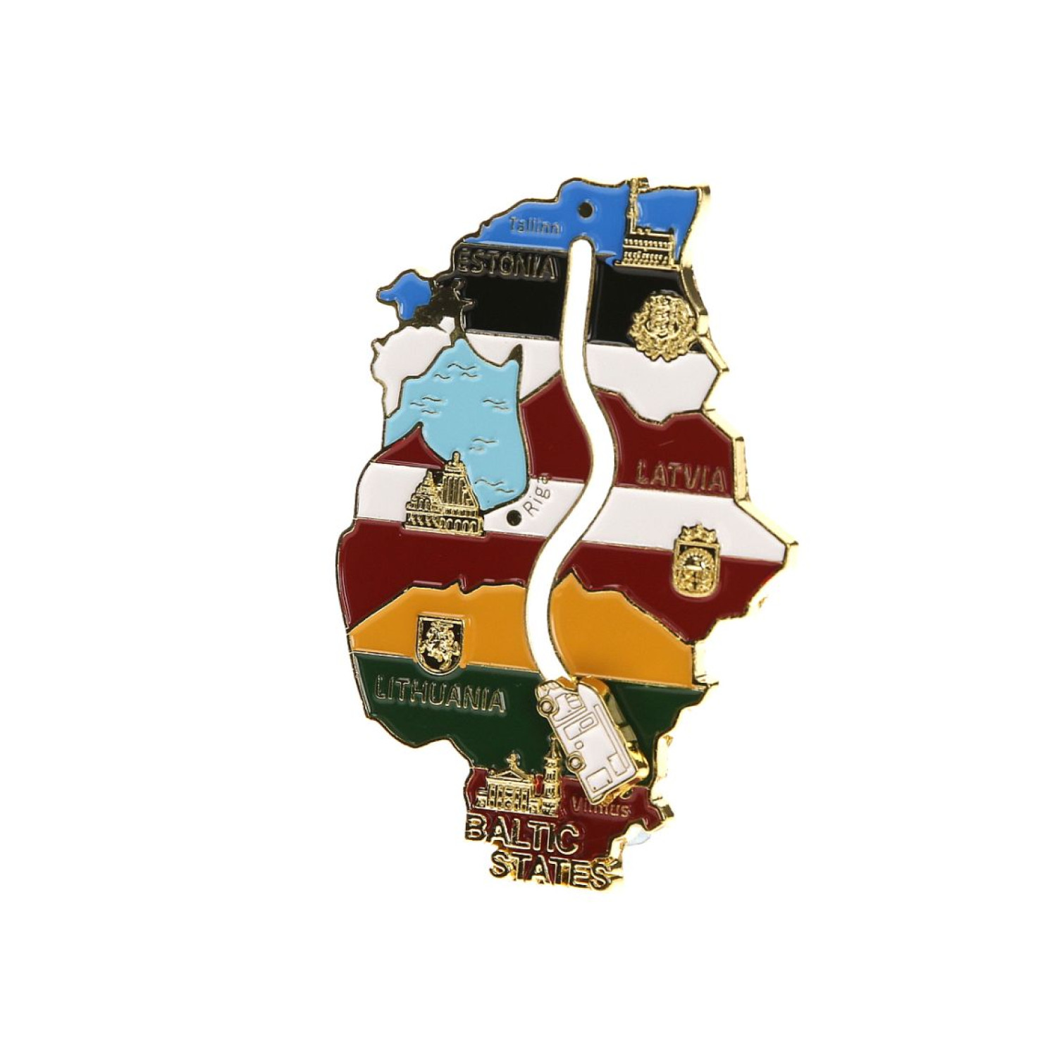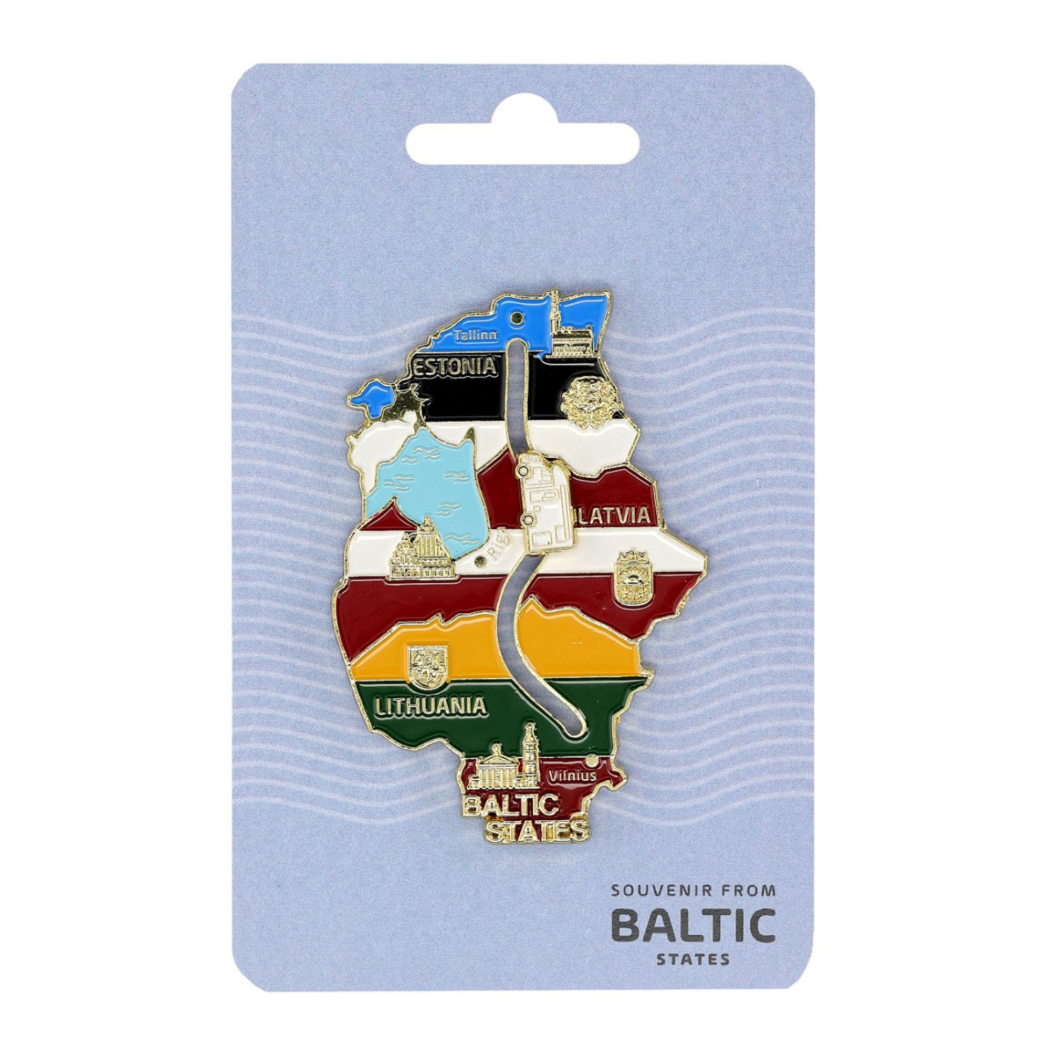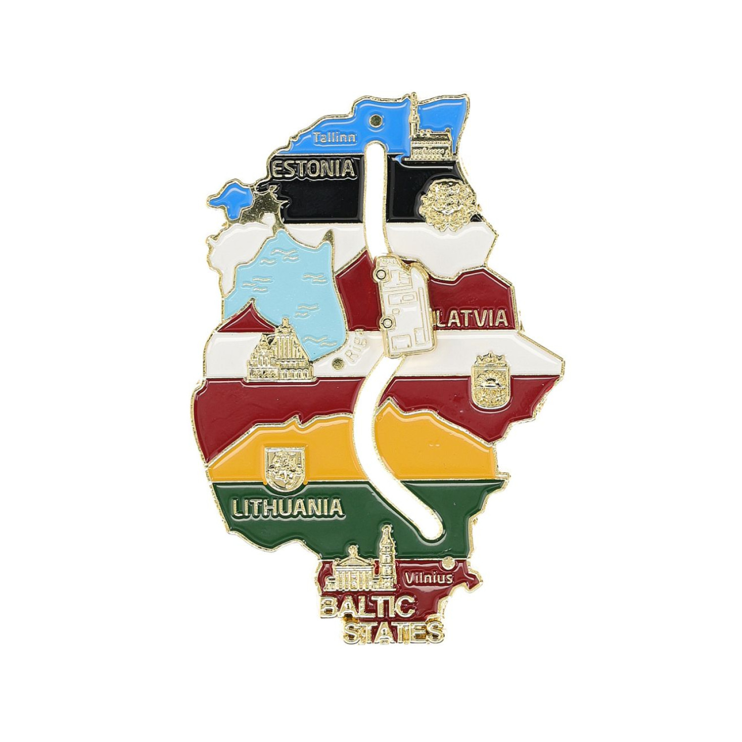 Krāsains suvenīru magnēts, kas attēlo Baltijas valstis – Lietuvu, Latviju un Igauniju. Kartē redzami nacionālie karogi, galvaspilsētas (Viļņa, Rīga, Tallina) un ievērojami arhitektūras simboli. Magnēta centrā – rotaļīga kustīga automašīna, kas ceļo cauri visām trim galvaspilsētām. Piemērots suvenīru tirdzniecībai.
