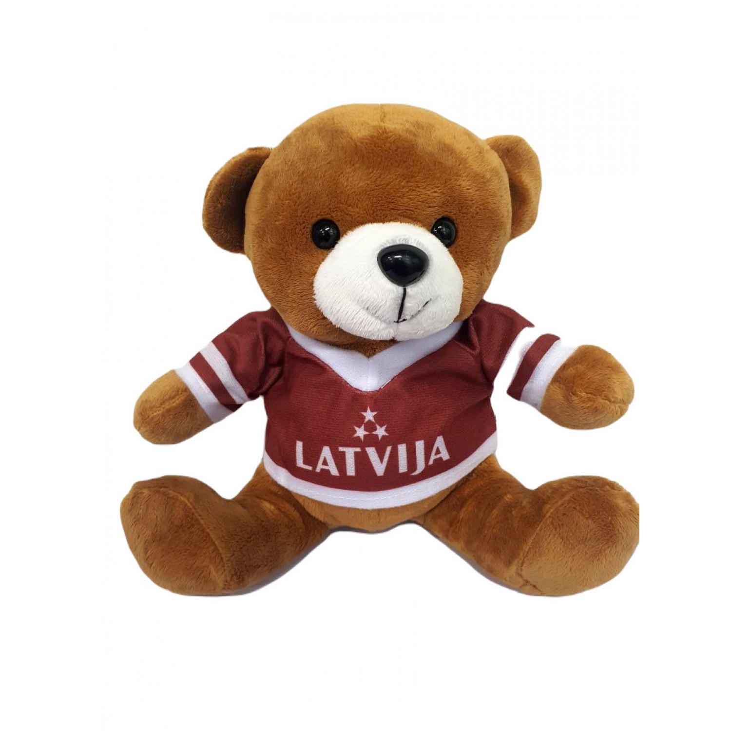 Brūns mīkstais lācis sarkanbaltsarkanā kreklā ar uzrakstu Latvija un valsts simboliku. Piemērots kā kvalitatīvs un patriotisks suvenīrs tirdzniecībai. Lieliski noder suvenīru tirgotājiem un veikaliem, kas piedāvā produktus ar Latvijas tematiku.