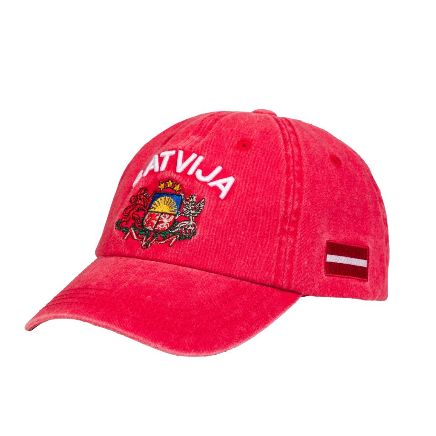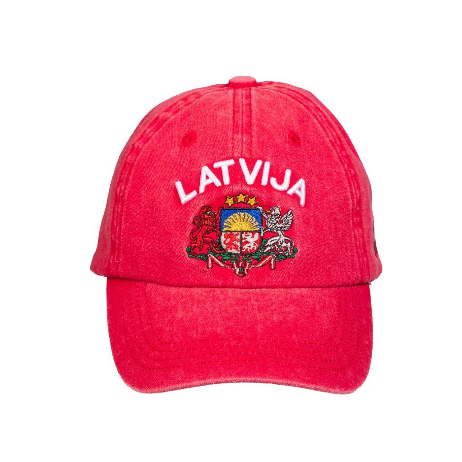 Rozā krāsas kokvilnas cepure ar malu, izšūts Latvijas valsts ģerbonis priekšpusē. Cepure ar regulējamu aizmugures siksniņu ērtai pielāgošanai.