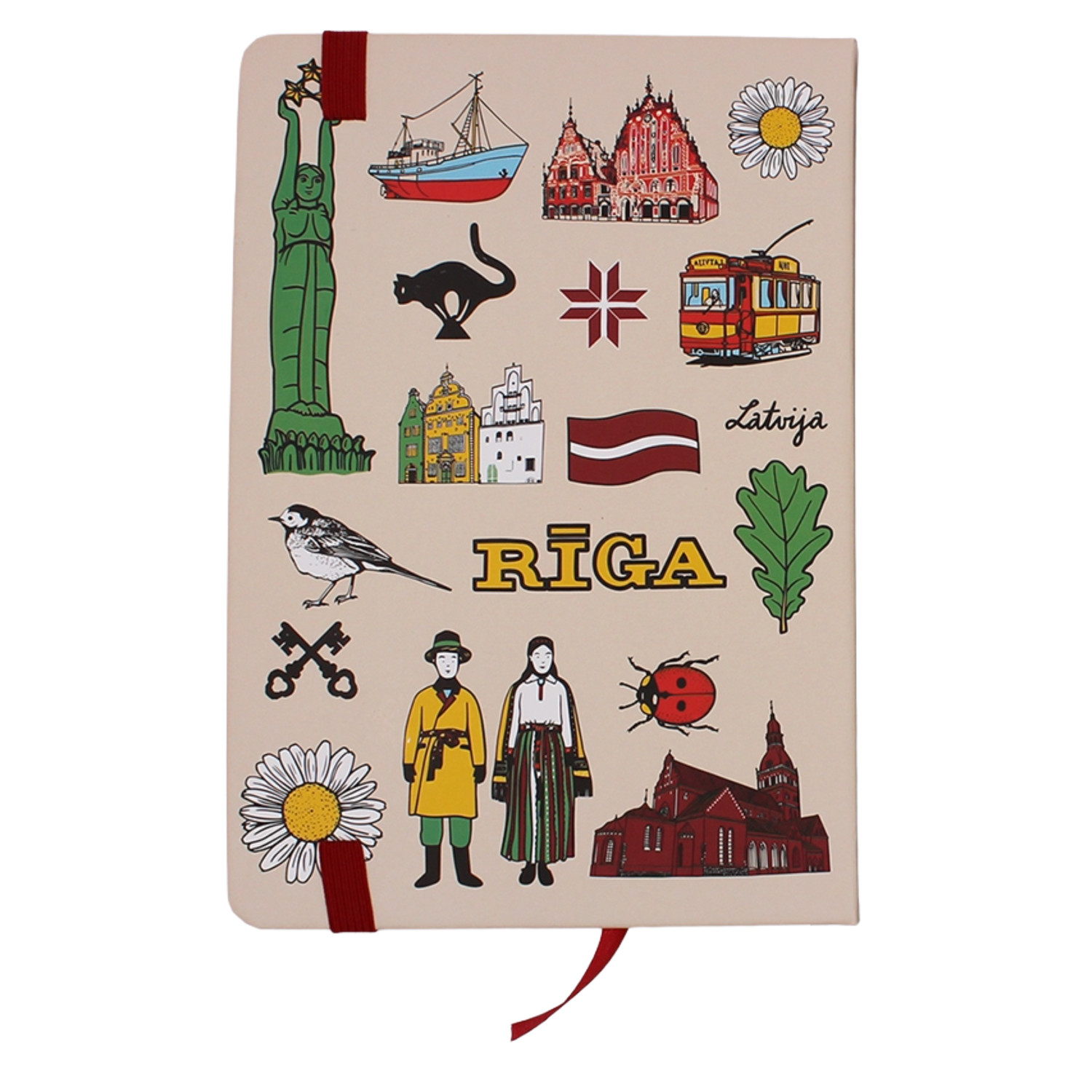 Piezīmju klade Latvija – krāsaina un stilīga klade ar ilustrācijām, kas atspoguļo Latvijas kultūru, arhitektūru un nacionālos simbolus. Vāku rotā Rīgas ainavas, tradicionāli motīvi un sarkana gumija ar kustīgu melna kaķa detaļu, kas piešķir rotaļīgumu un oriģinalitāti. Augstas kvalitātes papīrs, ērta lentes grāmatzīme un izturīgs iesējums nodrošina ērtu lietošanu darbā, mācībās vai ceļojumos. Lieliska dāvana vai suvenīrs ceļotājiem, patriotiem un Latvijas mīļotājiem.
