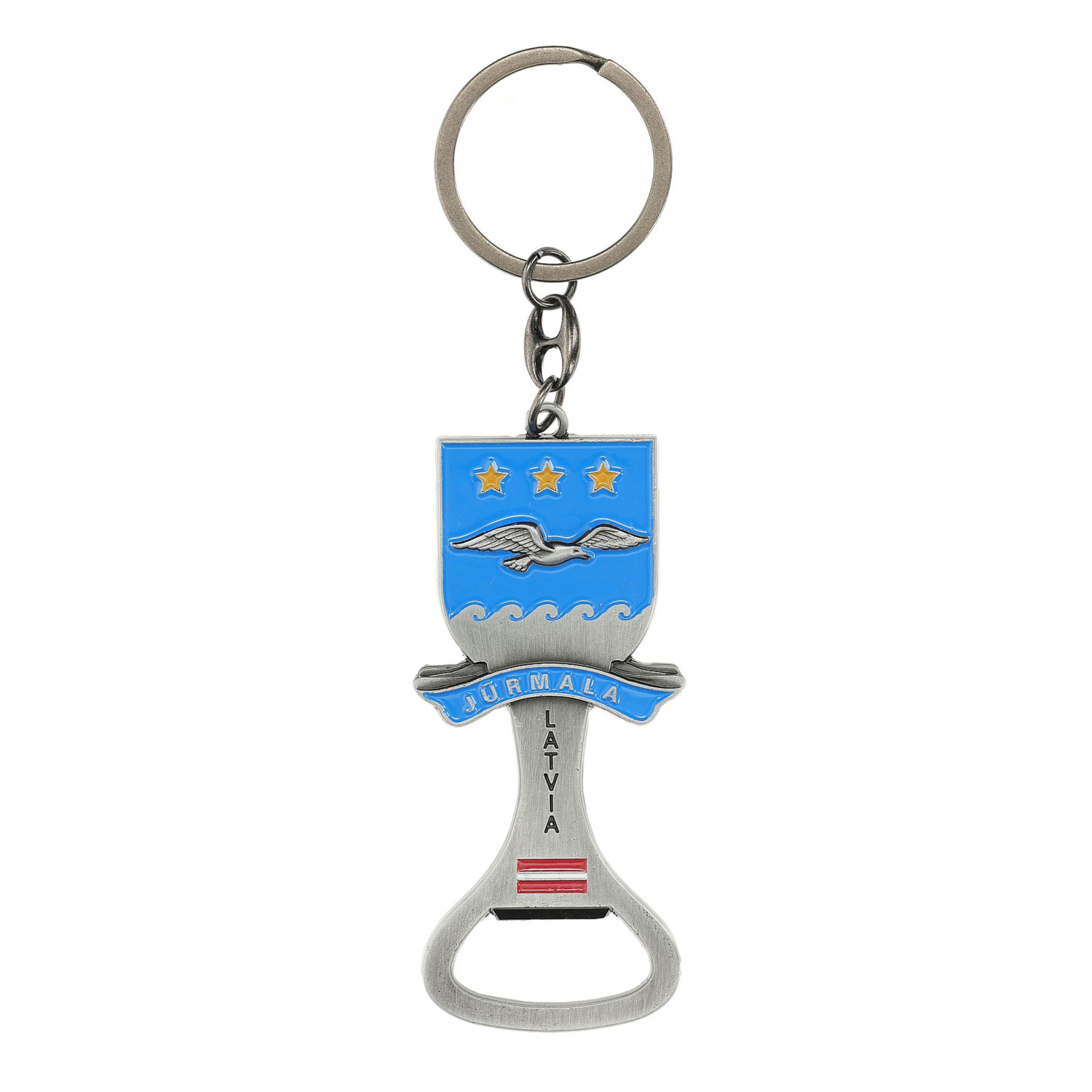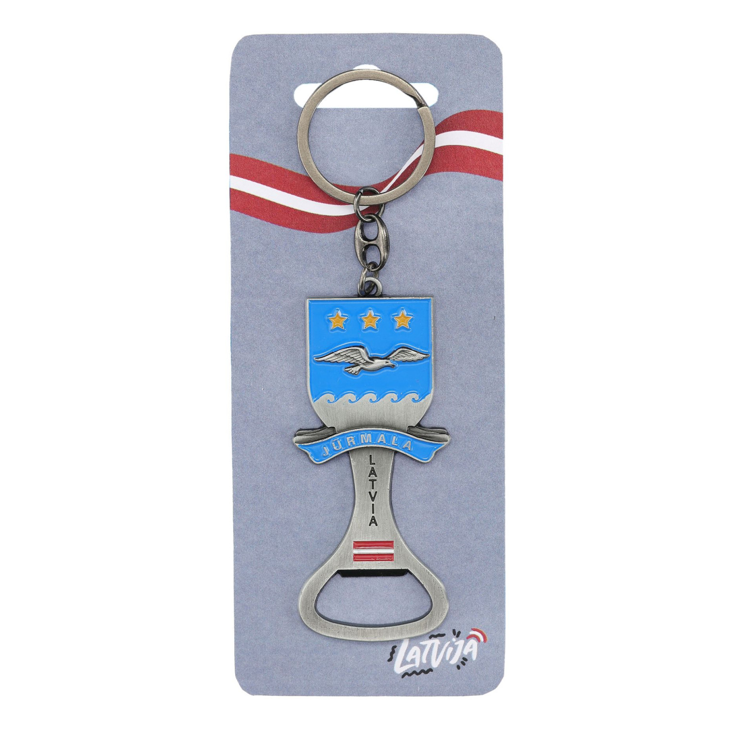 Metāla atslēgu piekariņš ar pudeļu atvērēju, uz kura attēlots Jūrmalas ģerbonis un Latvijas karogs. Praktisks un stilīgs suvenīrs Jūrmalas apmeklētājiem un Latvijas dāvanu veikaliem.