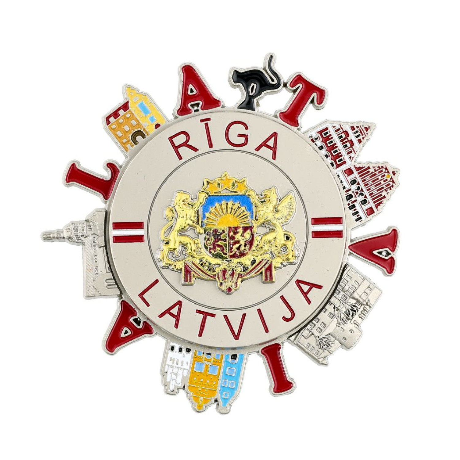 Metāla ledusskapja magnēts ar populāriem Rīgas simboliem un uzrakstu RĪGA LATVIJA uz rotējoša riteņa. Interaktīvs un pievilcīgs suvenīrs, ideāli piemērots suvenīru tirgotājiem.