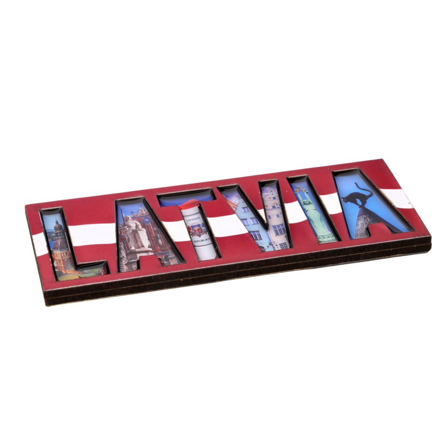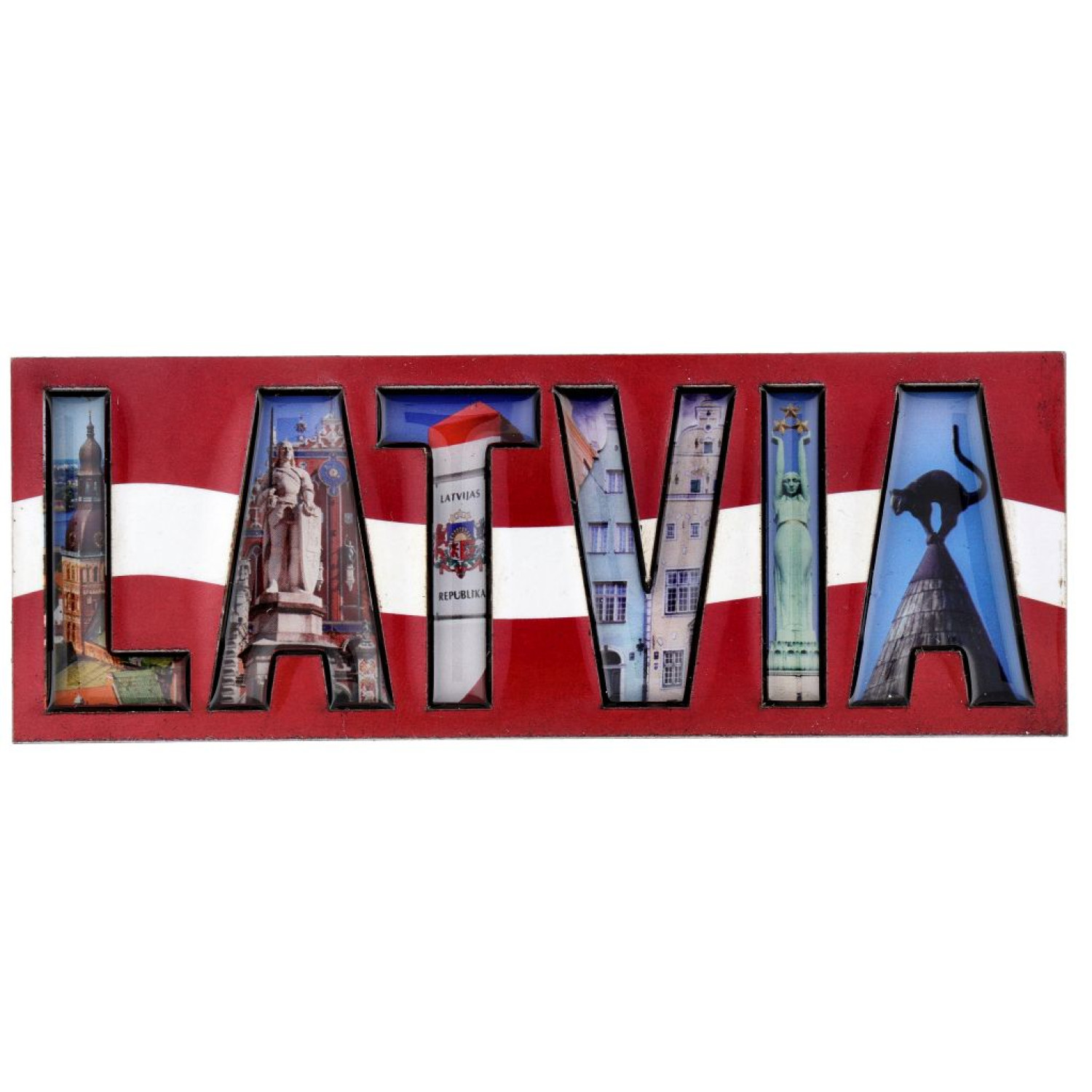 Dekoratīvs ledusskapja magnēts ar uzrakstu LATVIA, kura burti veidoti no Latvijas ainavu un objektu fotogrāfijām. Izgatavots no MDF materiāla ar epoksīda pārklājumu. Piemērots suvenīru tirgotājiem.