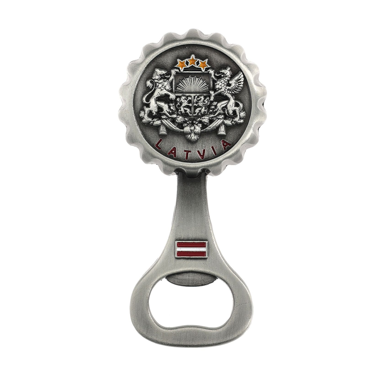 Kvalitatīvs metāla ledusskapja magnēts ar pudeļu attaisāmo, dekorēts ar Latvijas valsts ģerboni un karogu. Praktisks un simbolisks suvenīrs, piemērots tirgotājiem, kas specializējas Latvijas tematiskajā preču sortimentā.