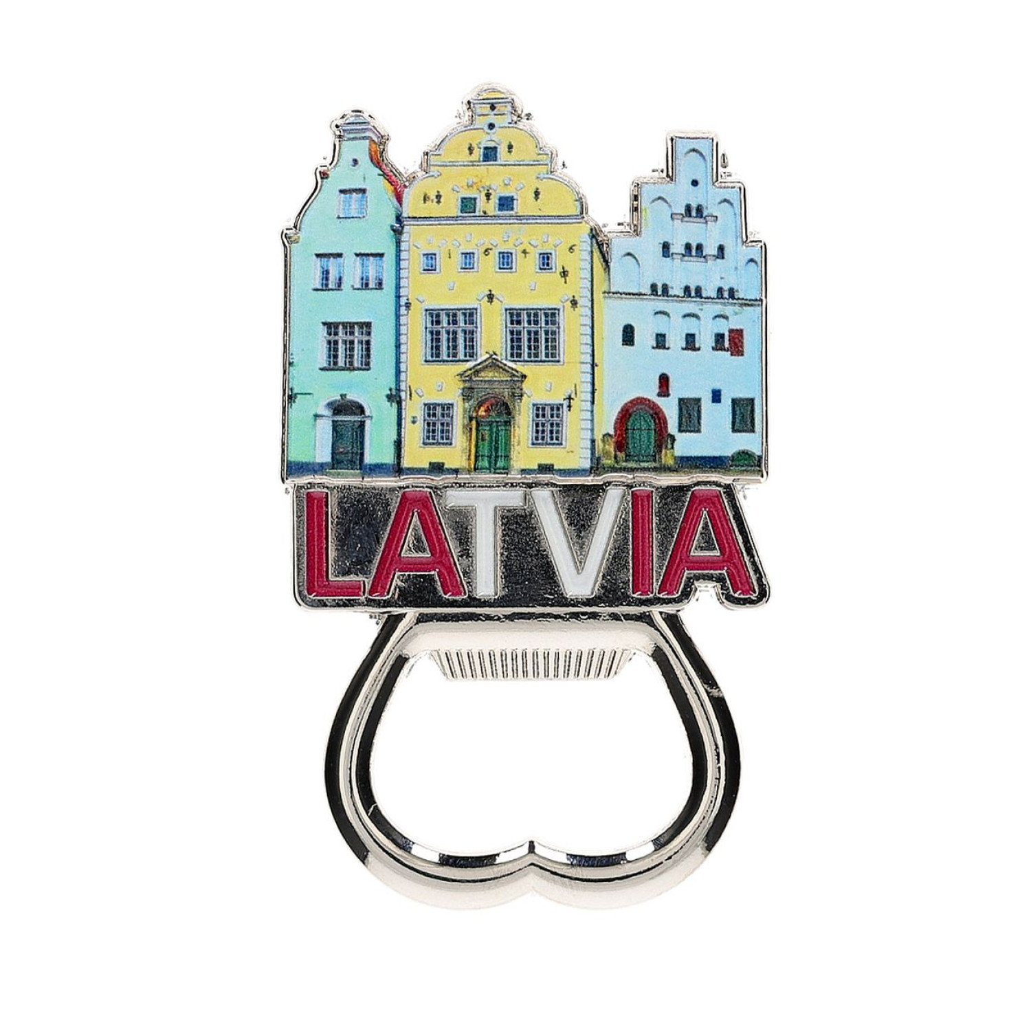 Metāla ledusskapja magnēts ar iebūvētu pudeļu atvērēju. Attēloti slavenie Rīgas Trīs brāļi un uzraksts Latvia. Apvieno praktiskumu un estētisku dizainu – lieliski piemērots Latvijas suvenīru tirdzniecībai vai interjeram.