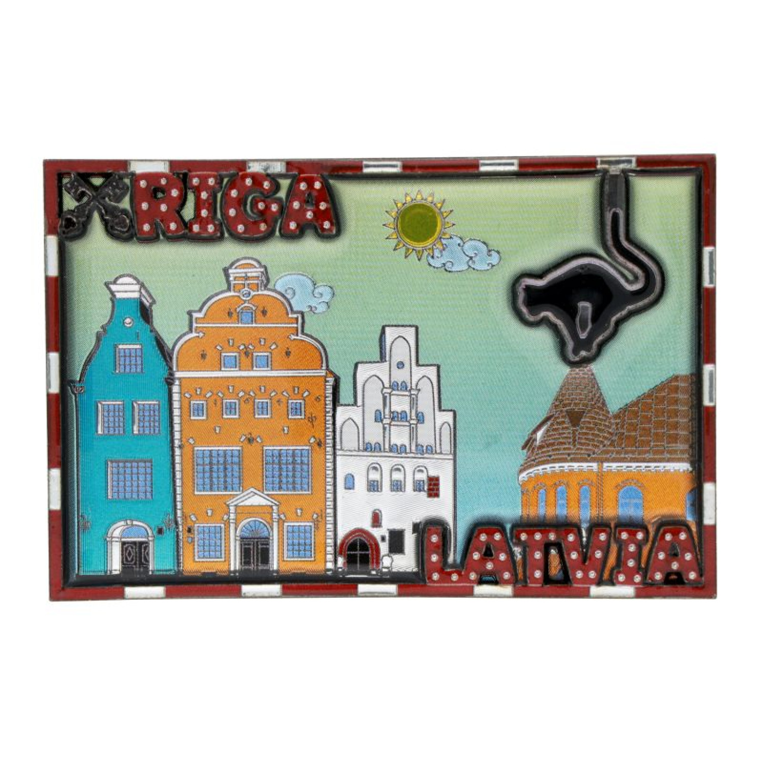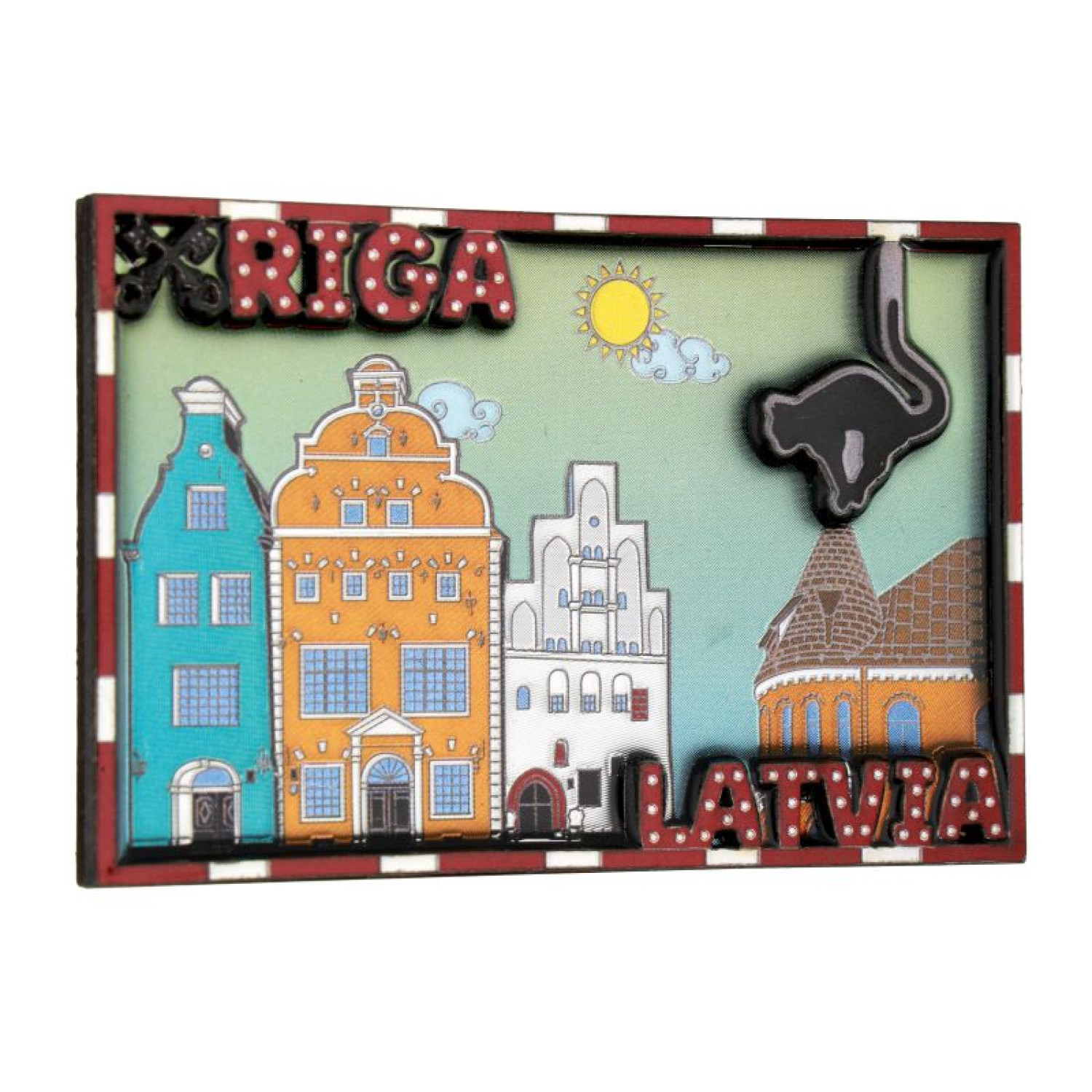 Krāsains suvenīru magnēts ar Rīgas slavenajiem Trīs Brāļiem un melna kaķa motīvu. Spilgts un rotaļīgs dizains, kas piesaista uzmanību un piemērots suvenīru tirdzniecībai.