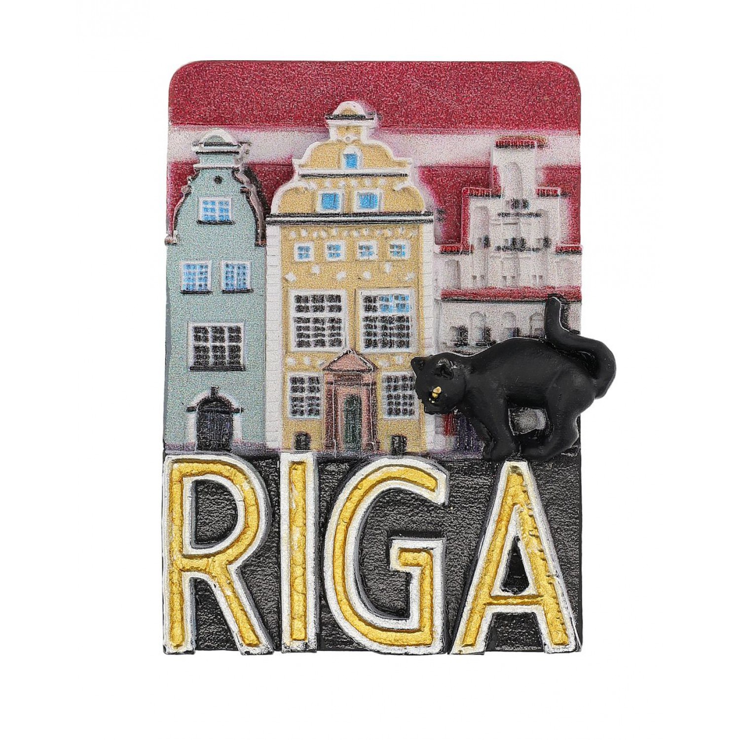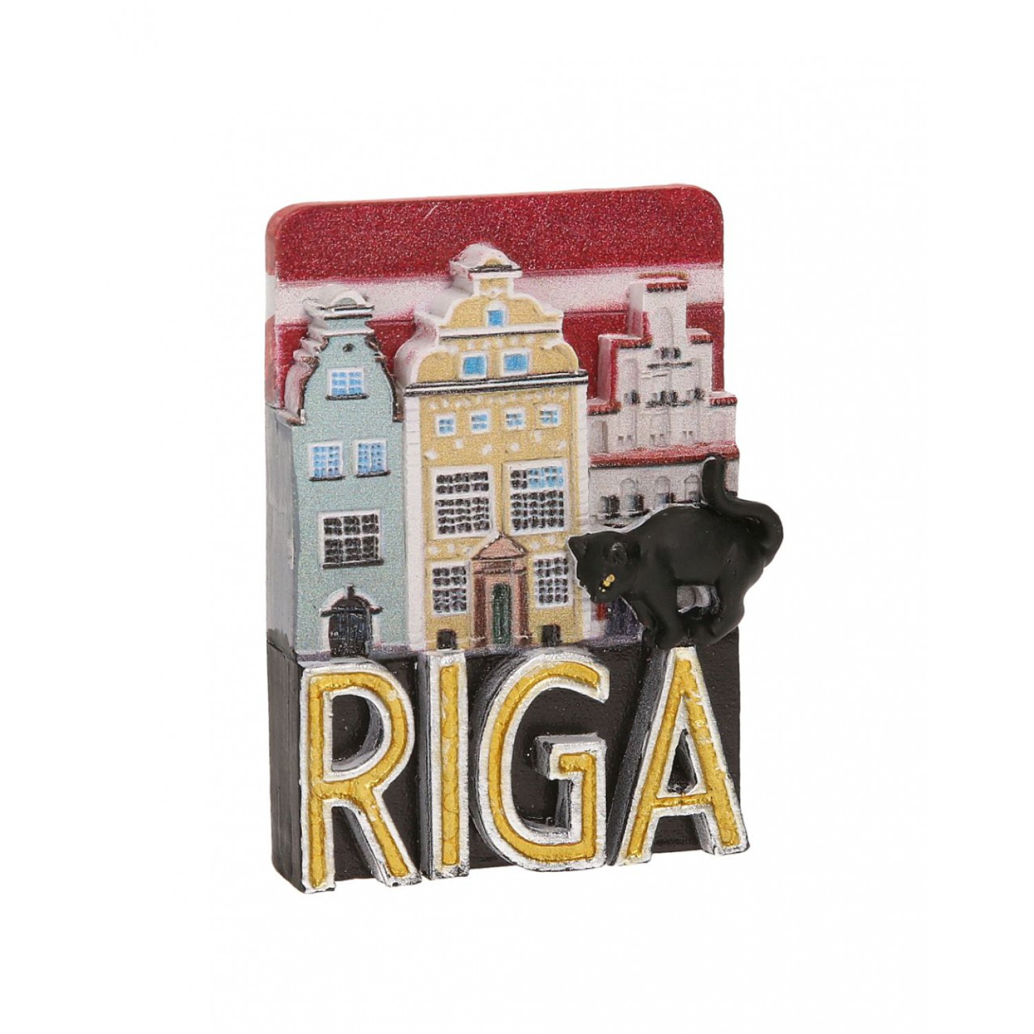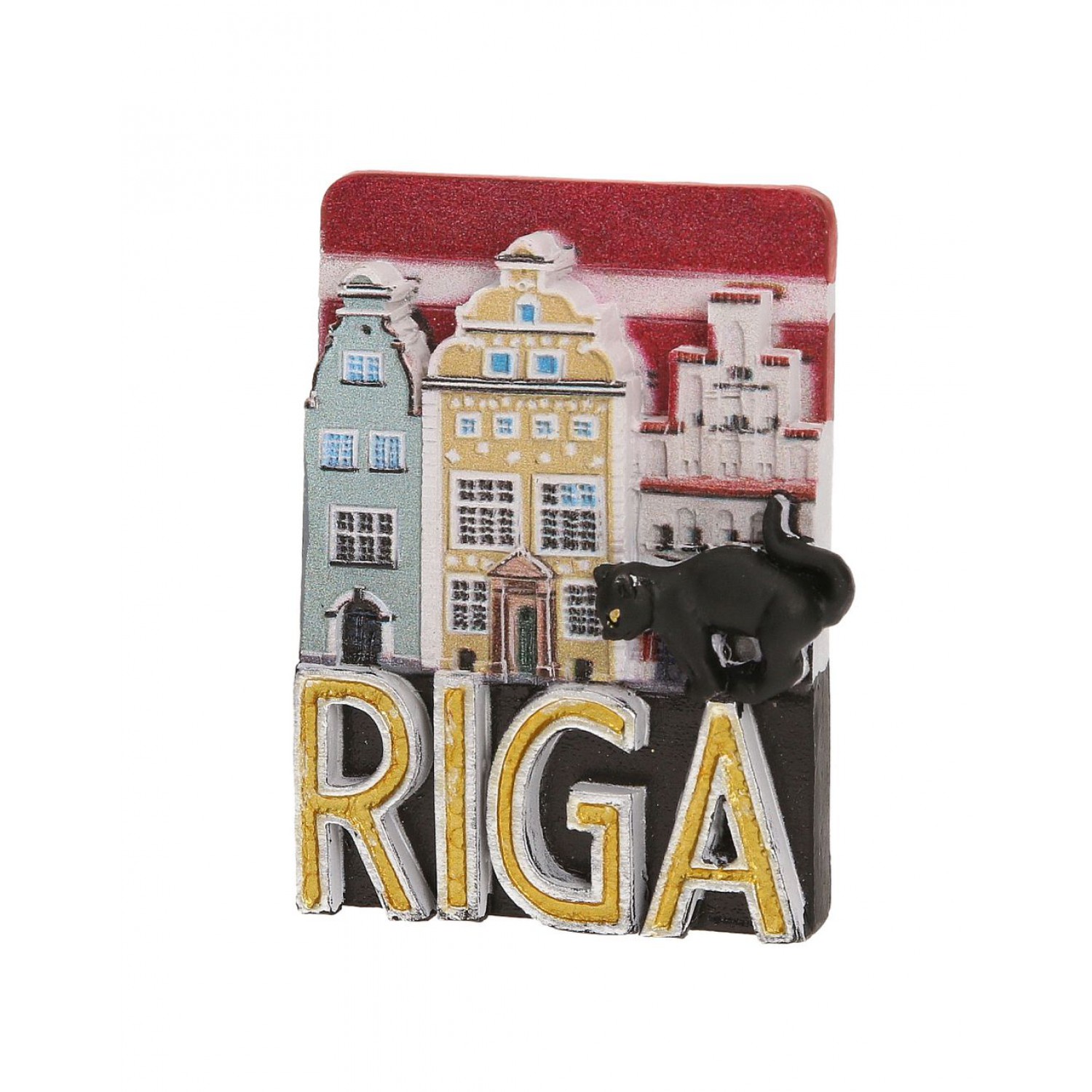Krāsains ledusskapja magnēts ar Rīgas slavenajām Trīs brāļu ēkām un melno kaķa statuju. Izgatavots no izturīga materiāla, tas lieliski atspoguļo Rīgas bagāto arhitektūras mantojumu. Piemērots gan mazumtirdzniecībai, gan kolekcijām.