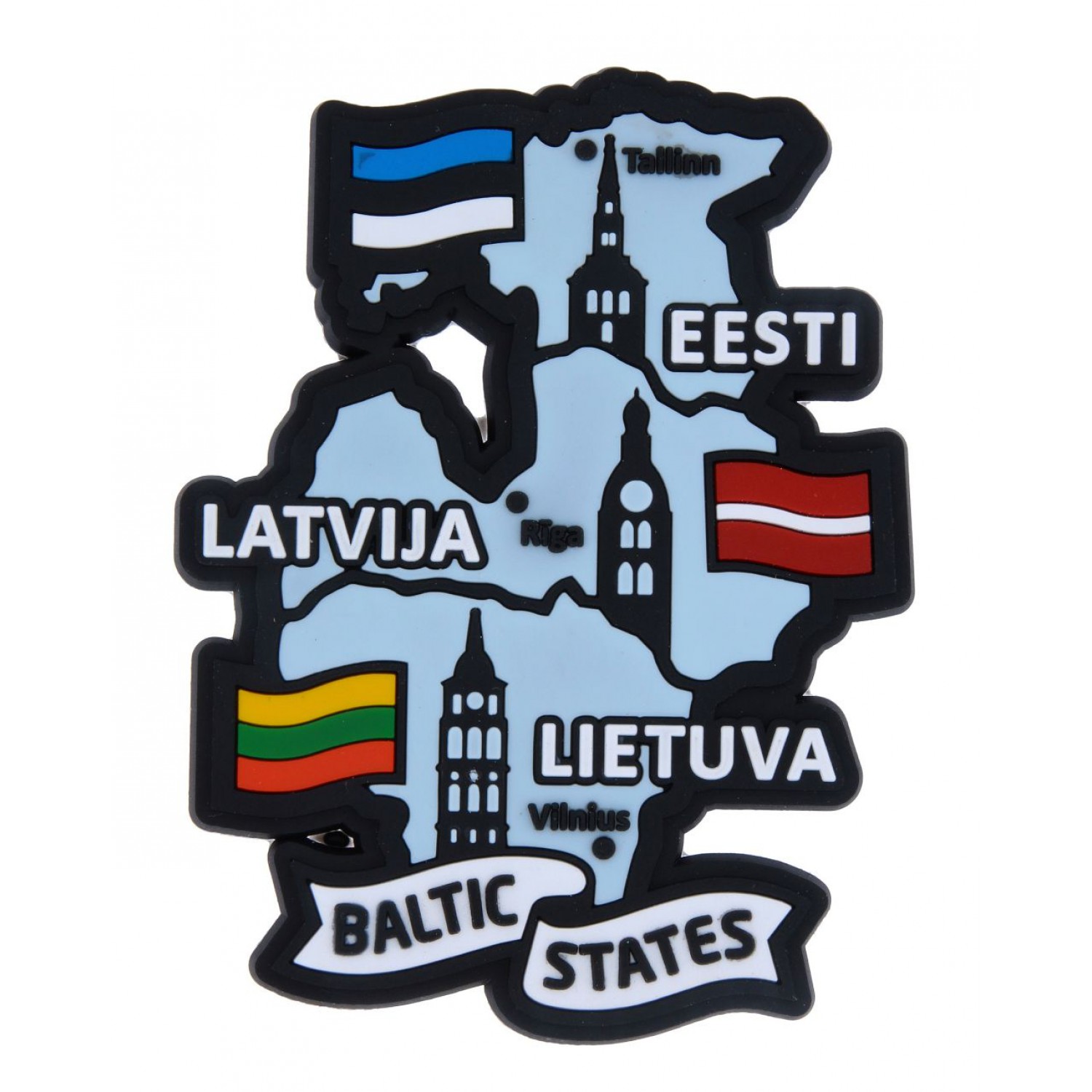 Krāsains PVC magnēts ar Baltijas valstīm – Igauniju, Latviju un Lietuvu. Katru valsti attēlo karogs un galvaspilsēta: Tallina, Rīga un Viļņa. Detalizēts dizains ar uzrakstu Baltic States. Piemērots tūristiem vai suvenīru veikaliem.