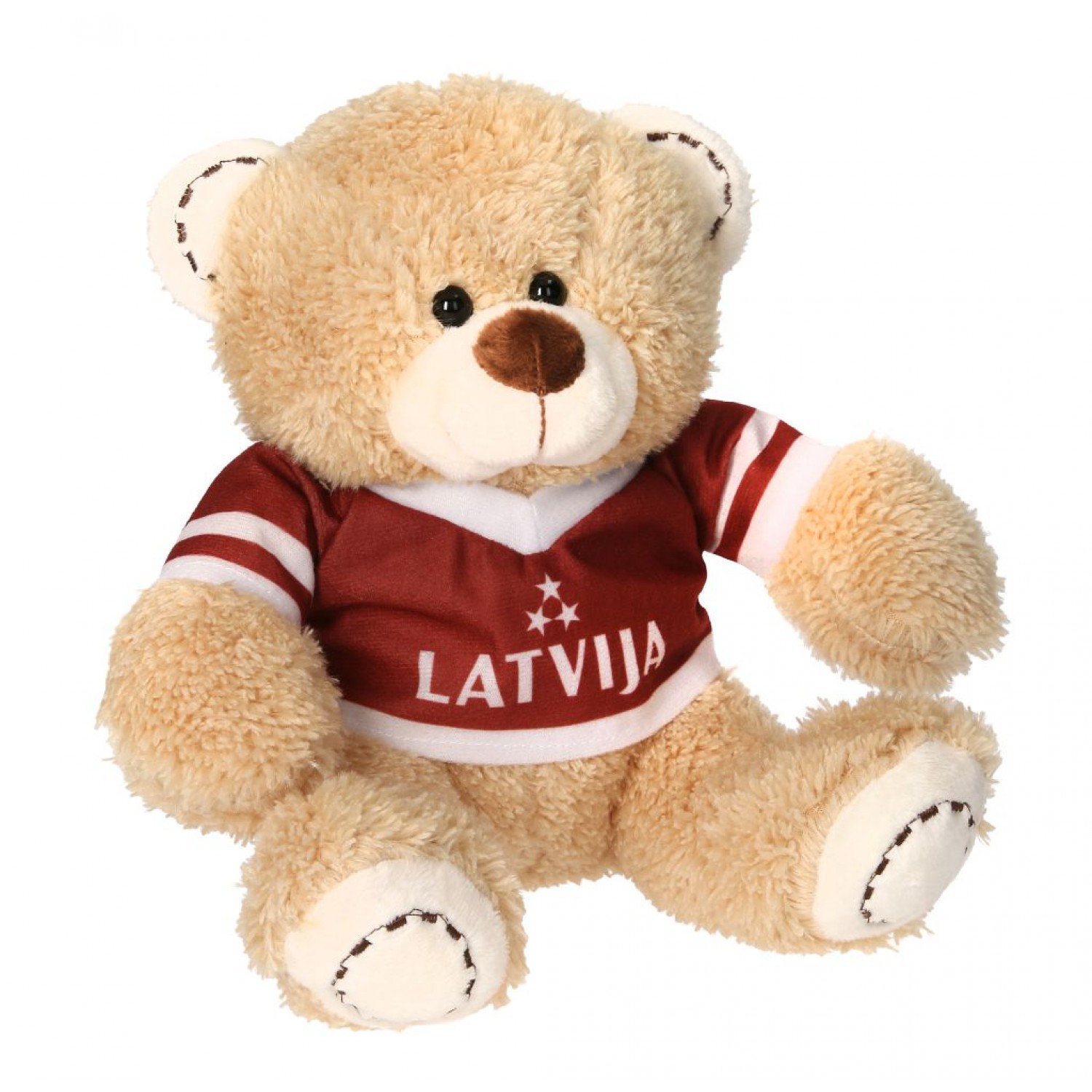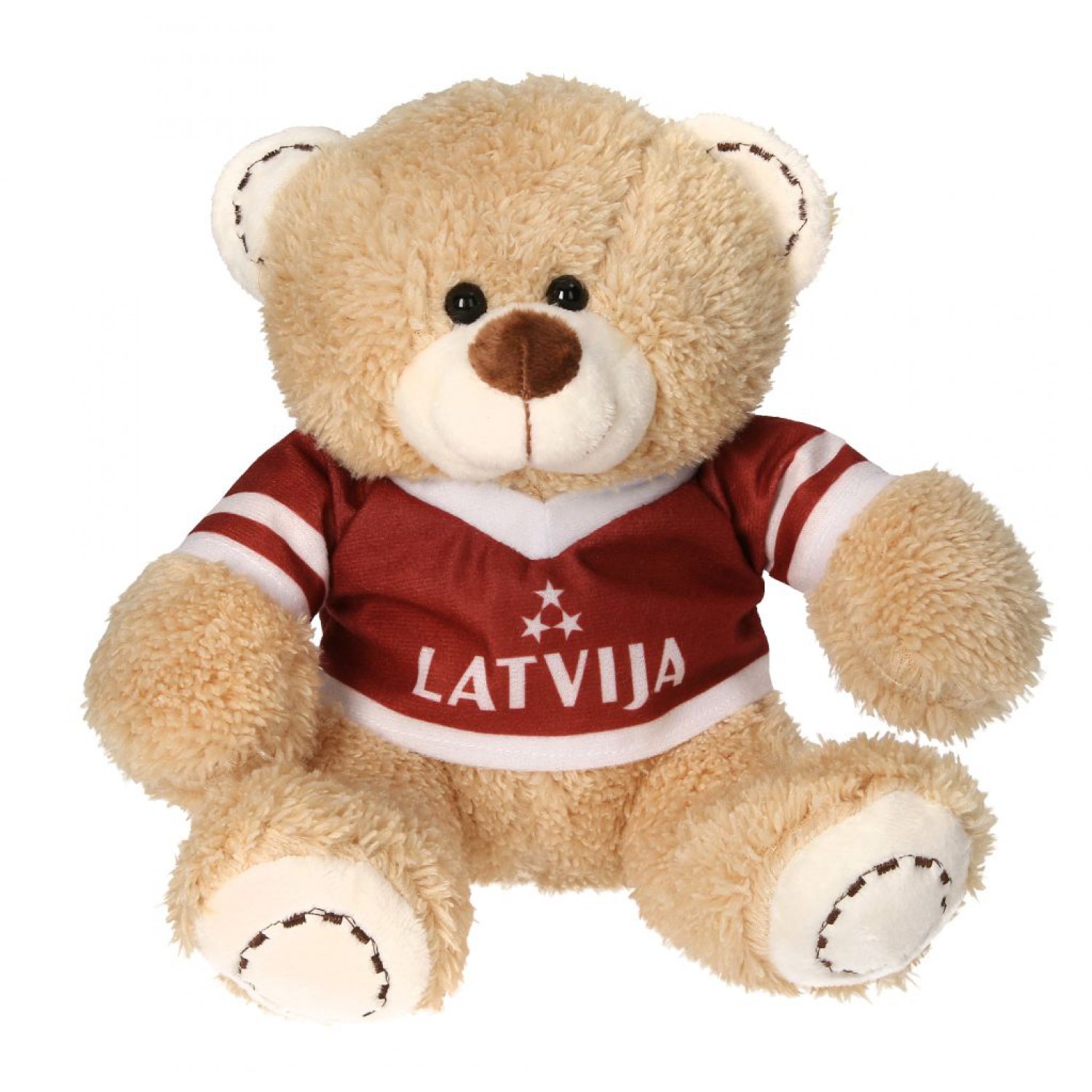 Šis mīkstais plīša lācis ir tērpies Latvijas karoga krāsu kreklā ar uzrakstu LATVIJA. Mīksts un mājīgs, lieliski piemērots kā dāvana bērniem un pieaugušajiem vai kā suvenīrs no Latvijas.