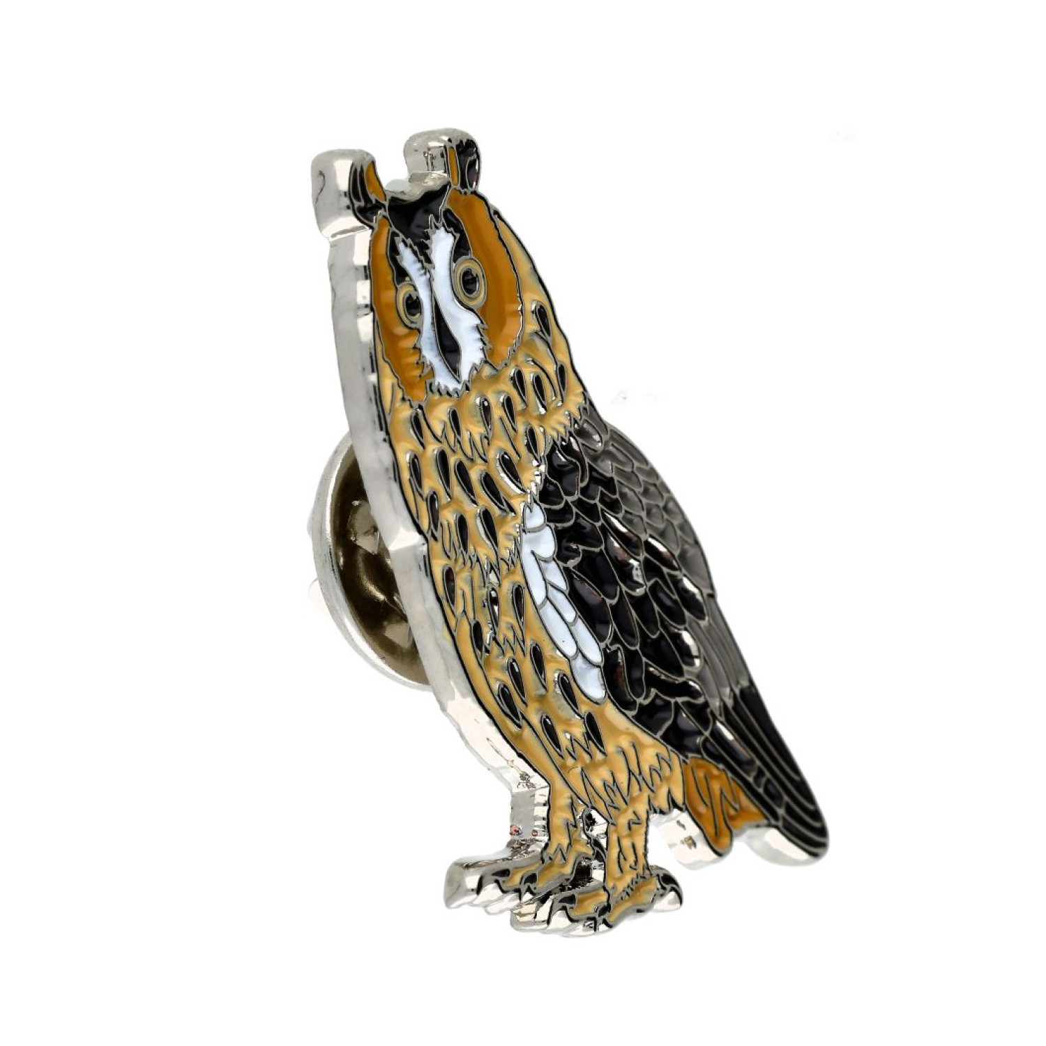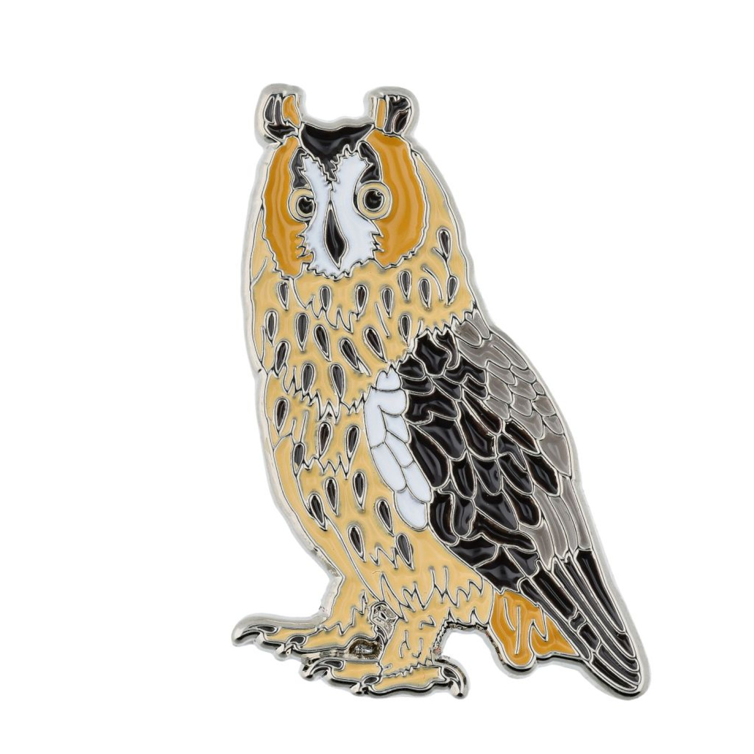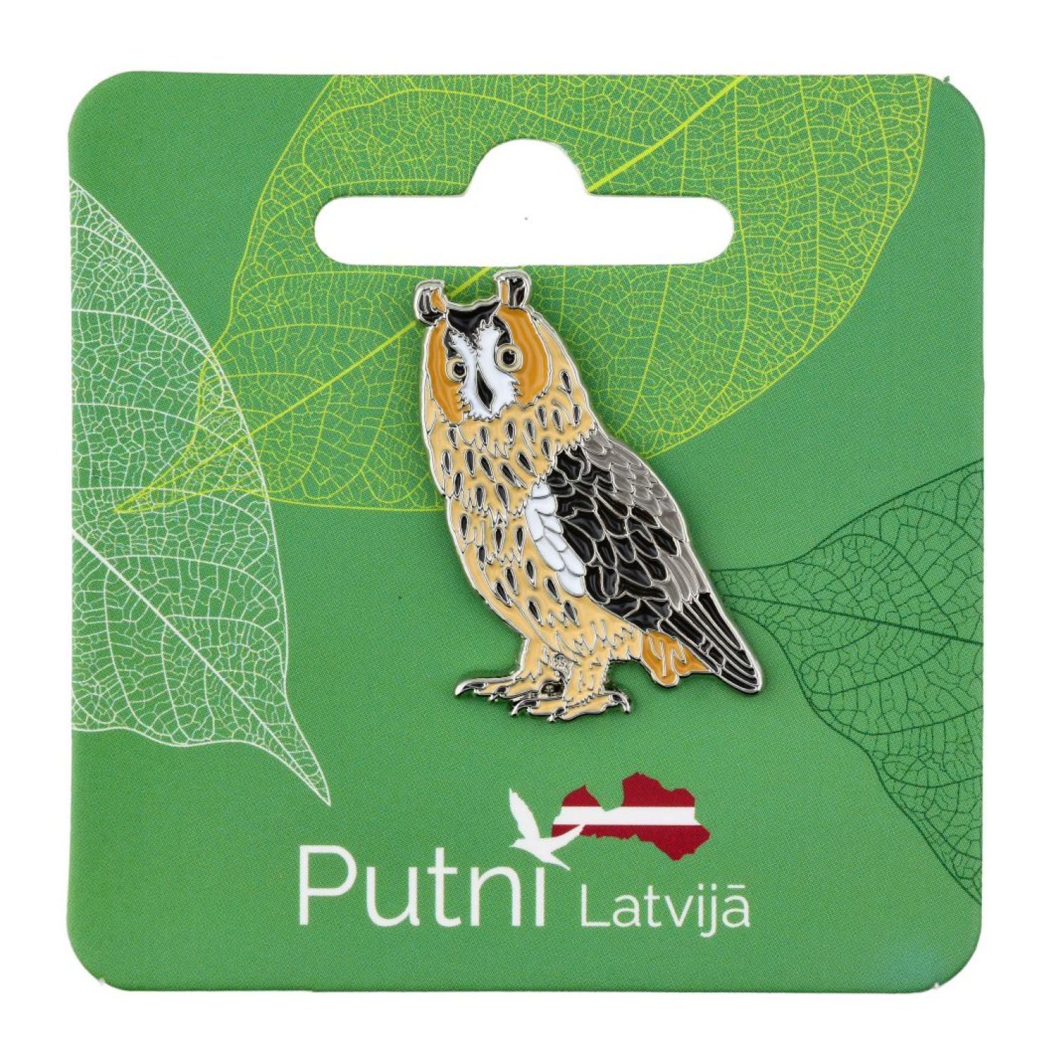 Metāla nozīmīte ar Ausainās pūces (Asio otus) attēlu. Košas krāsas un detalizēts dizains. Lieliski piemērota putnu vērotājiem un dabas cienītājiem.