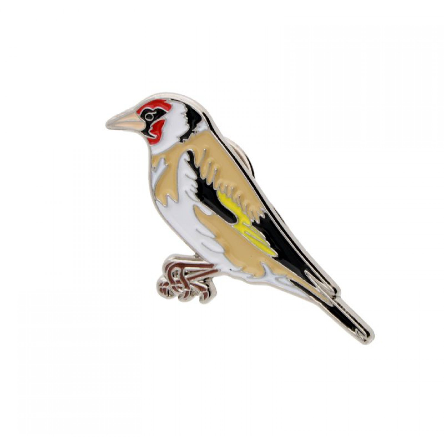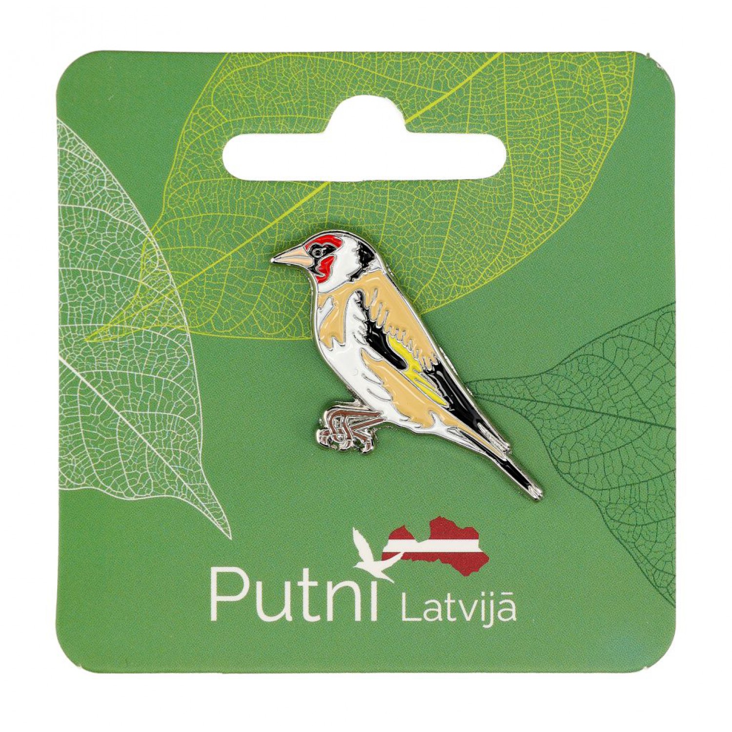 Metāla piespraude ar dadzīša attēlu (Carduelis carduelis).