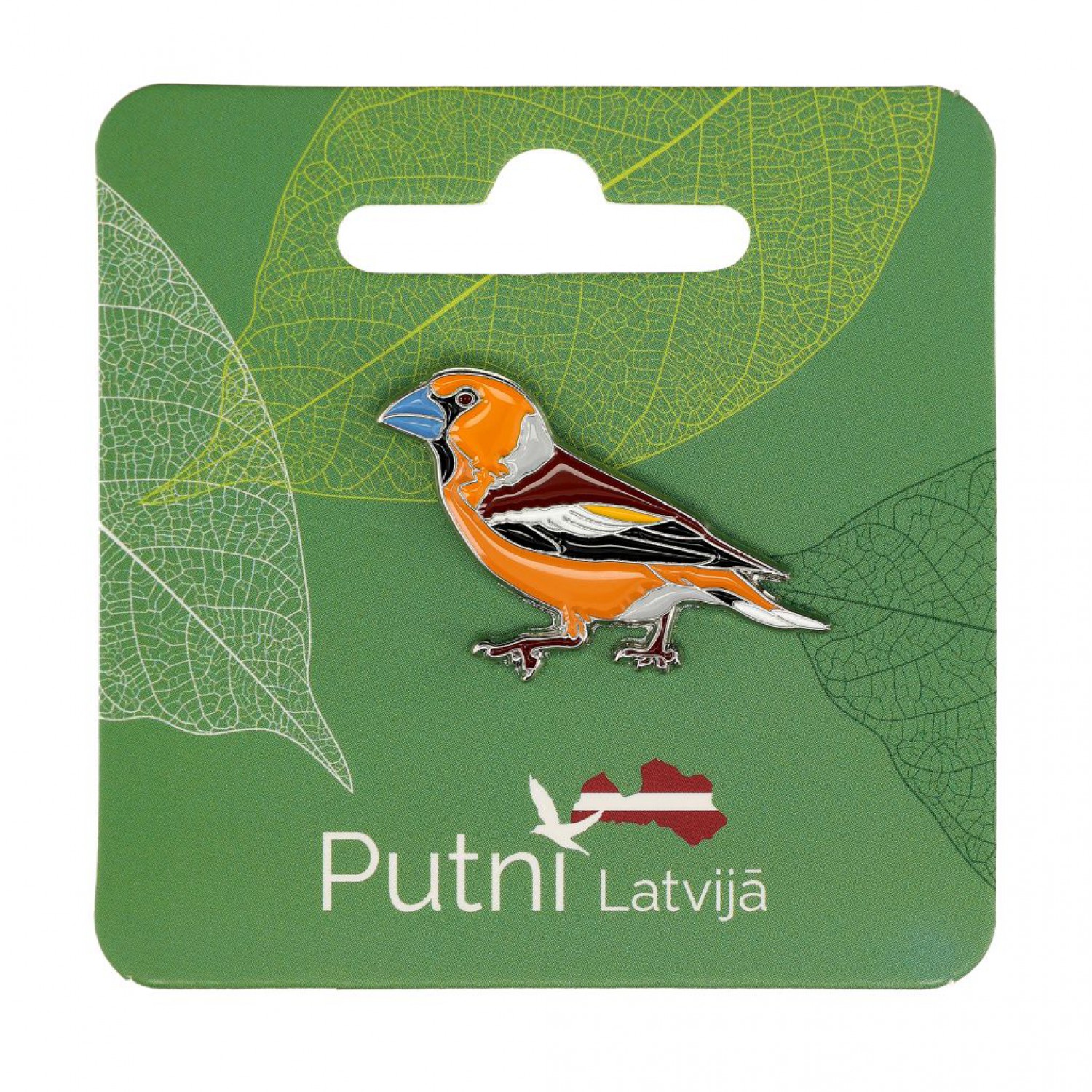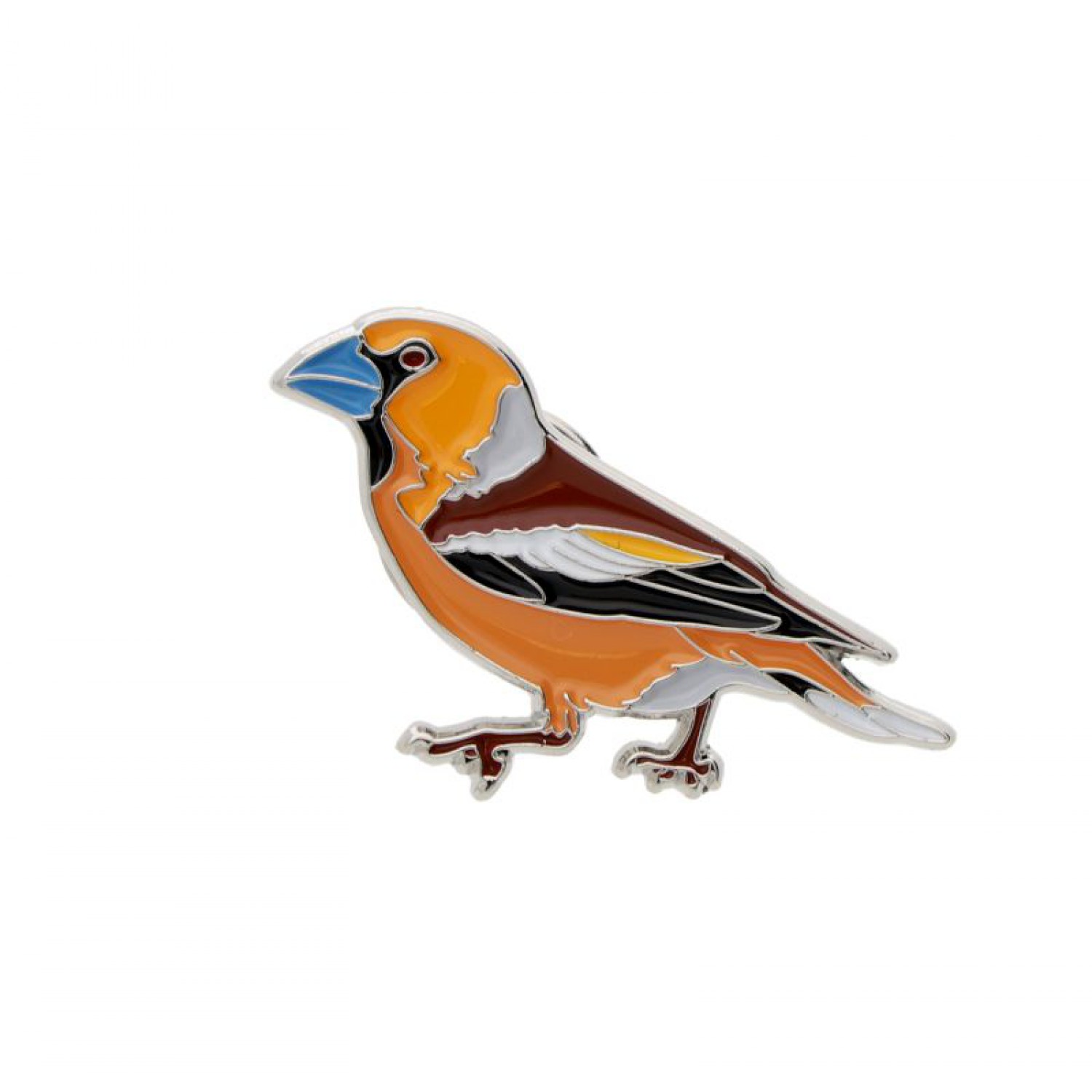 Metāla piespraude ar putnu Dižknābis (Coccothraustes coccothraustes).