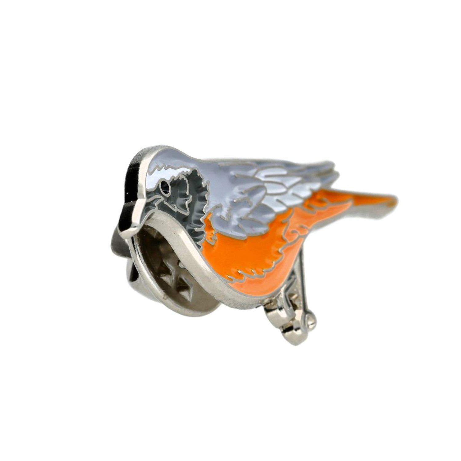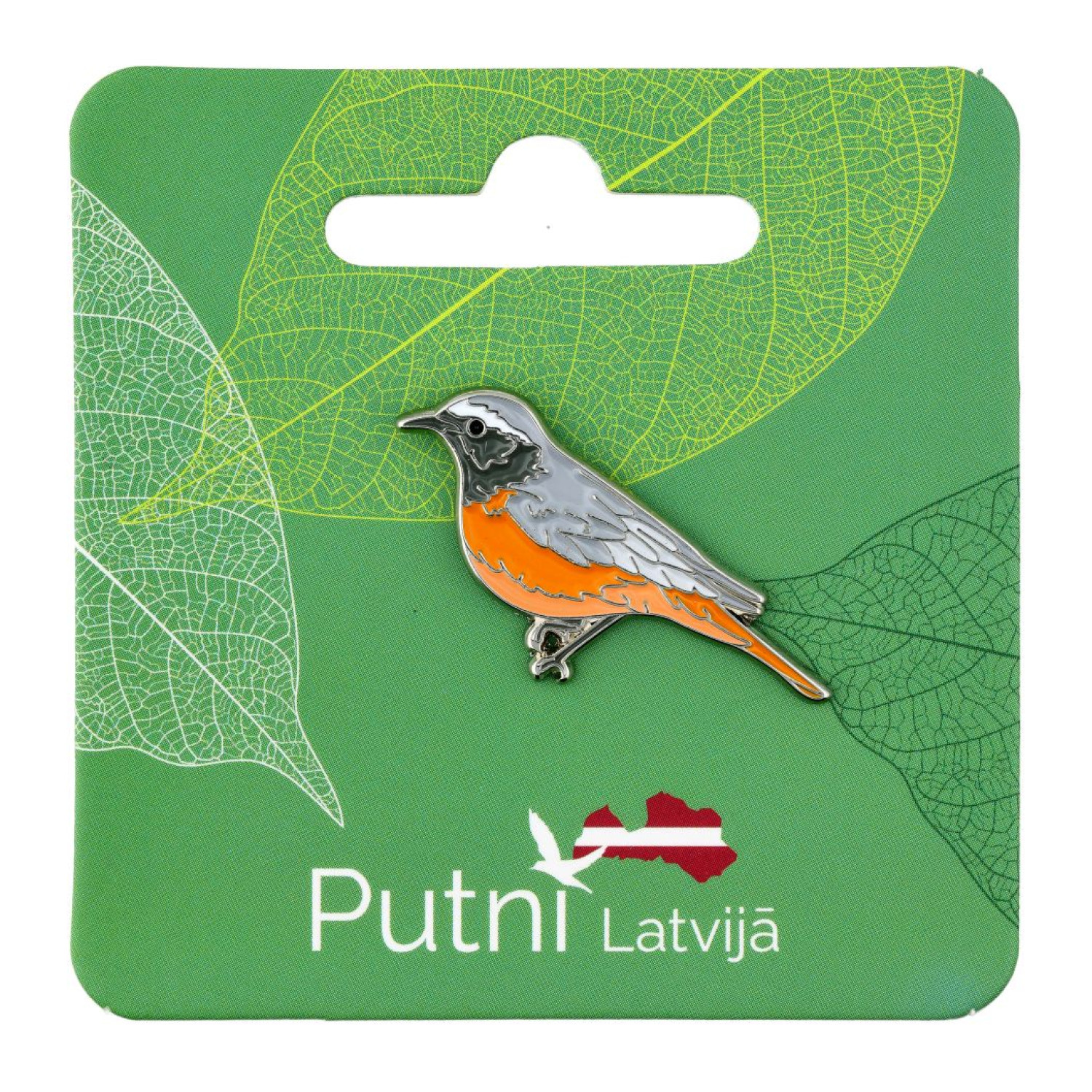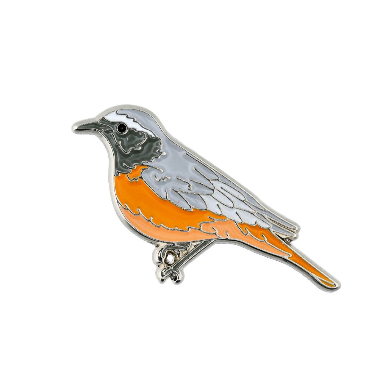 Metāla piespraude ar putnu Erickiņš (Phoenicurus phoenicurus).