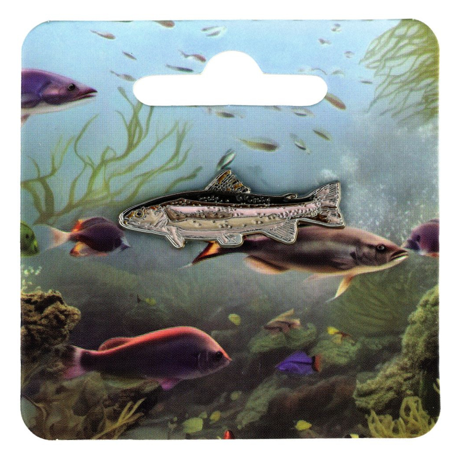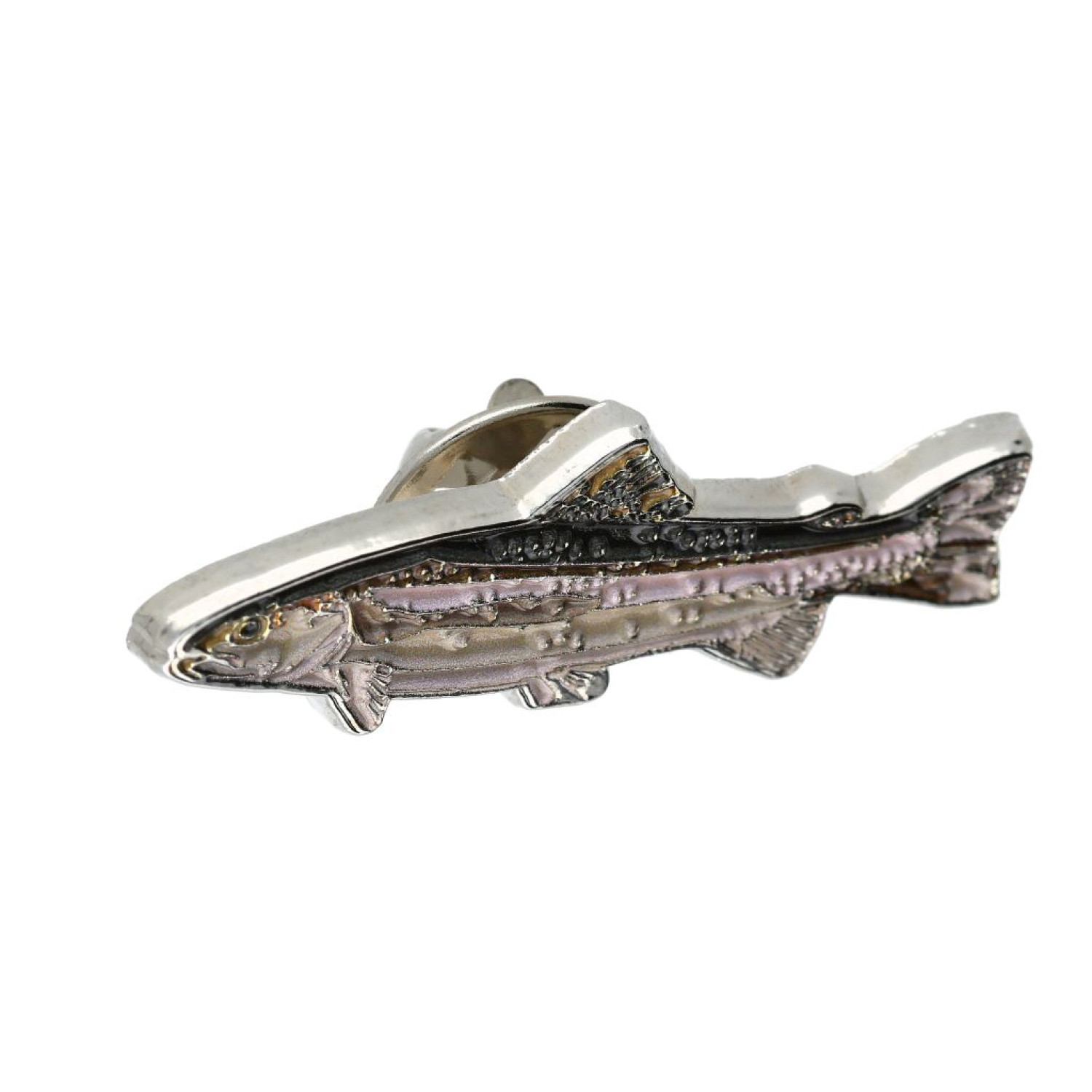 Emaljas metāla nozīmīte ar strauta foreli — lielisks aksesuārs makšķerniekiem, dabas cienītājiem un kolekcionāriem.
