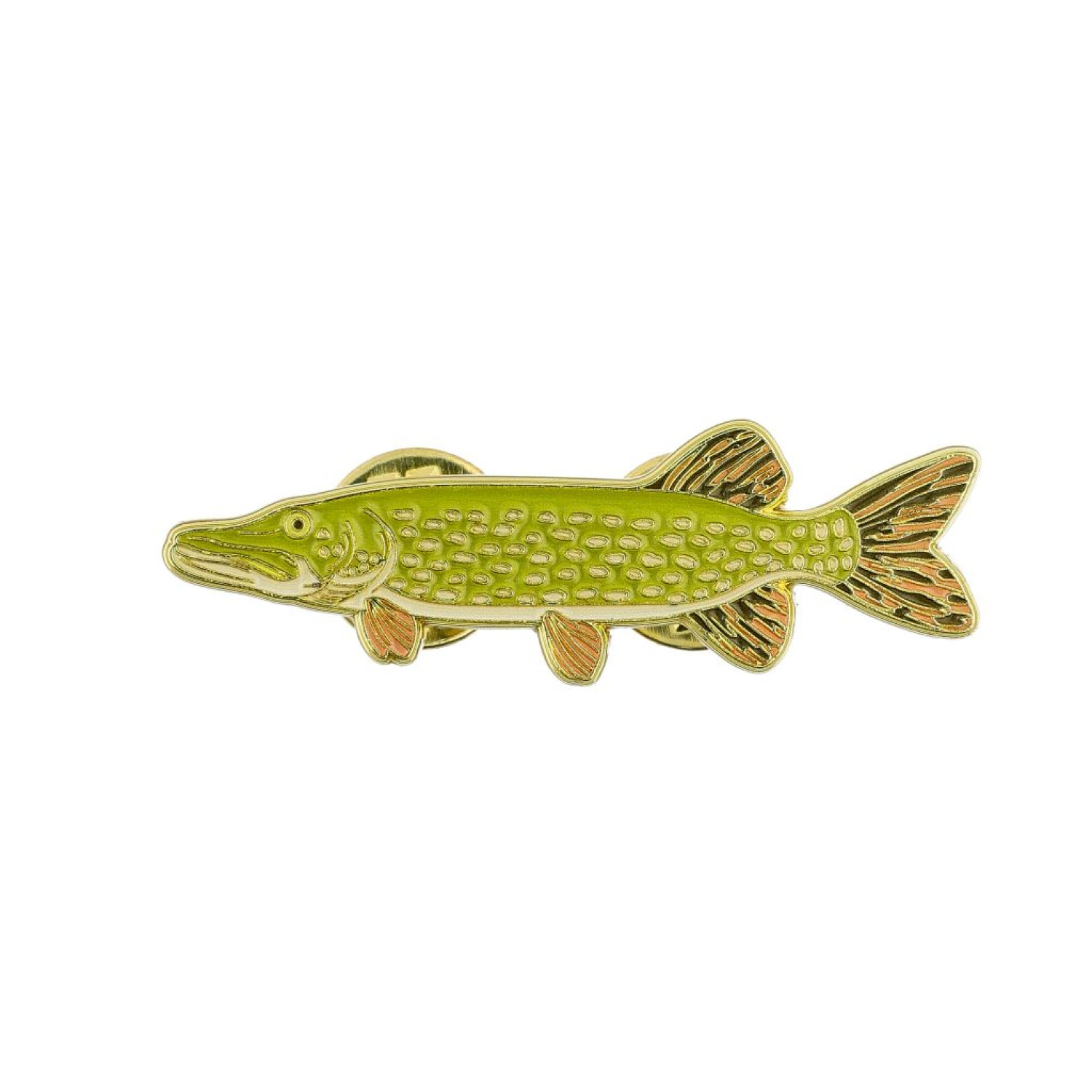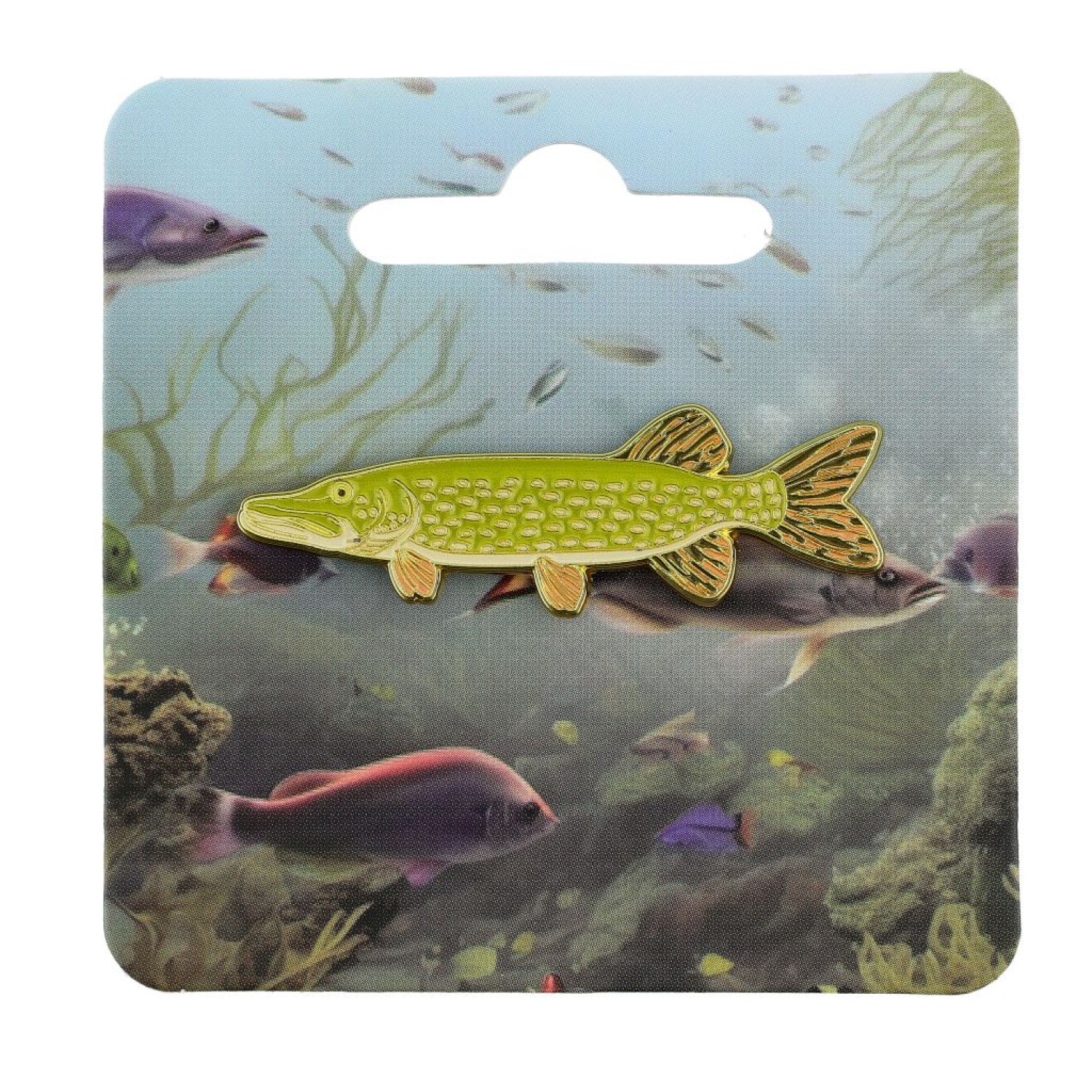 Emaljas metāla nozīmīte ar parasto līdaku – lielisks aksesuārs makšķerniekiem, dabas un zivju cienītājiem.