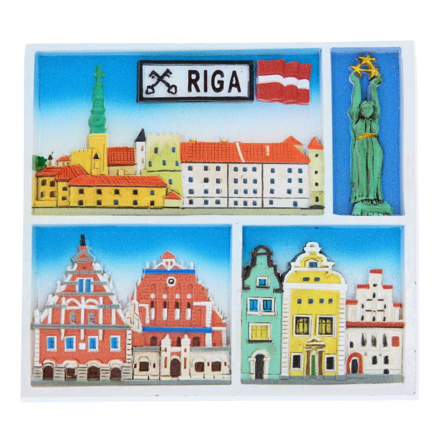 Šis krāsainais ledusskapja magnēts ir izgatavots no izturīga polirezīna un attēlo Rīgas ikoniskākos objektus: Rīgas pili, Brīvības pieminekli, arhitektūras ansambli Trīs brāļi un Melngalvju namu. Roku krāsotās detaļas izceļ Latvijas galvaspilsētas autentisko šarmu.