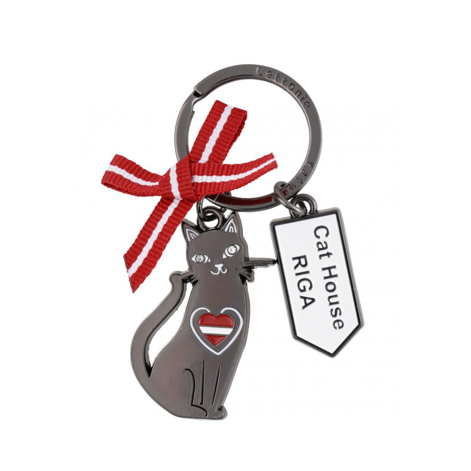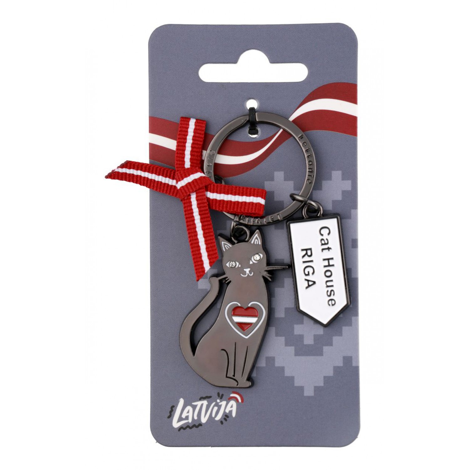 Metāla atslēgu piekariņš ar Rīgas Kaķu nama iedvesmotu dizainu. Komplektā kaķa figūriņa, norāde Cat House Riga un lentīte Latvijas karoga krāsās. Simbolisks un pievilcīgs suvenīrs suvenīru tirgotājiem.