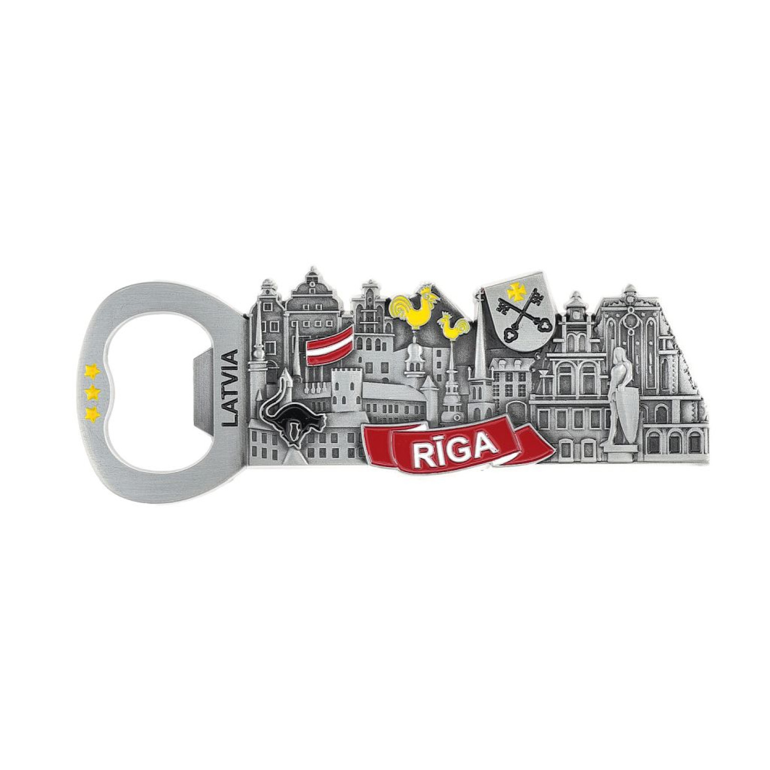 Stilīgs un funkcionāls ledusskapja magnēts ar pudeļu attaisāmu, kas attēlo Rīgas pilsētas panorāmu un slavenākās arhitektūras celtnes. Lielisks suvenīrs no Latvijas, kas piemērots gan kolekcionāriem, gan tūristiem. Izturīgs materiāls un kvalitatīvs dizains padara to par lielisku dāvanu un atmiņas lietu.