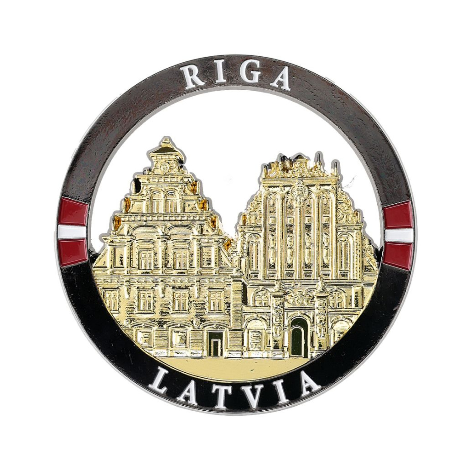 Metāla ledusskapja magnēts ar Melngalvju nama attēlu Rīgā Latvijā. Izgatavots zelta un melnā krāsā. Eleganta izvēle Rīgas cienītājiem un suvenīru tirgotājiem.