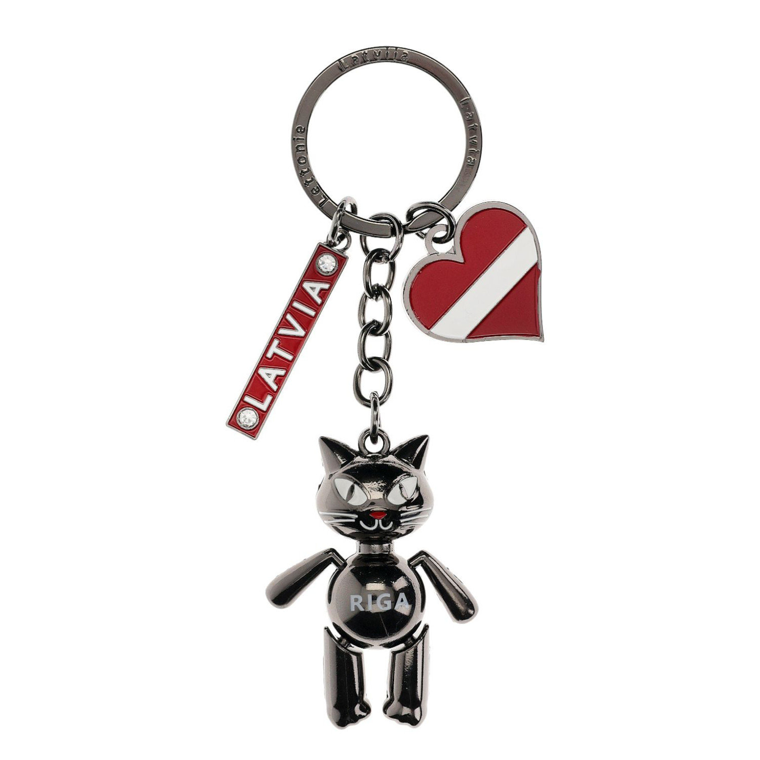 Metāla atslēgu piekariņš ar melnu kaķi kā Rīgas simbolu, papildināts ar sirds formas piekariņu Latvijas karoga krāsās un uzrakstu Latvia. Stilīgs un simbolisks suvenīrs, piemērots dāvanu un suvenīru veikaliem.