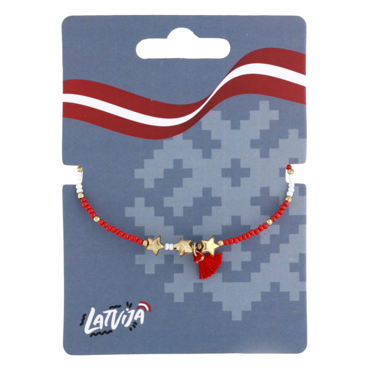 Eleganta rokassprādze Latvijas karoga krāsās – sarkans, balts, sarkans – ar trim zelta zvaigznēm. Simbolisks aksesuārs, kas atspoguļo lepnumu par Latviju un tās kultūru.
