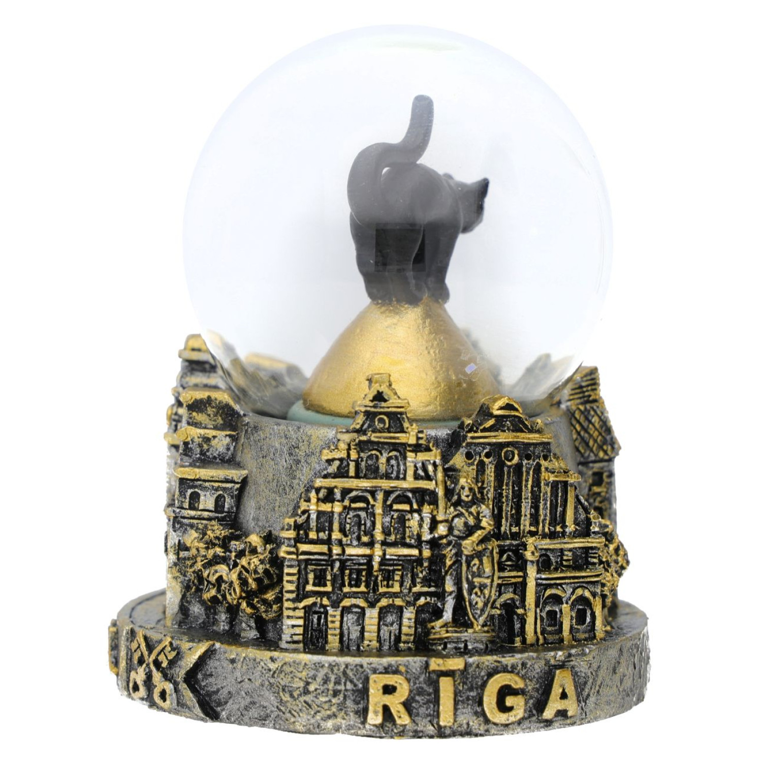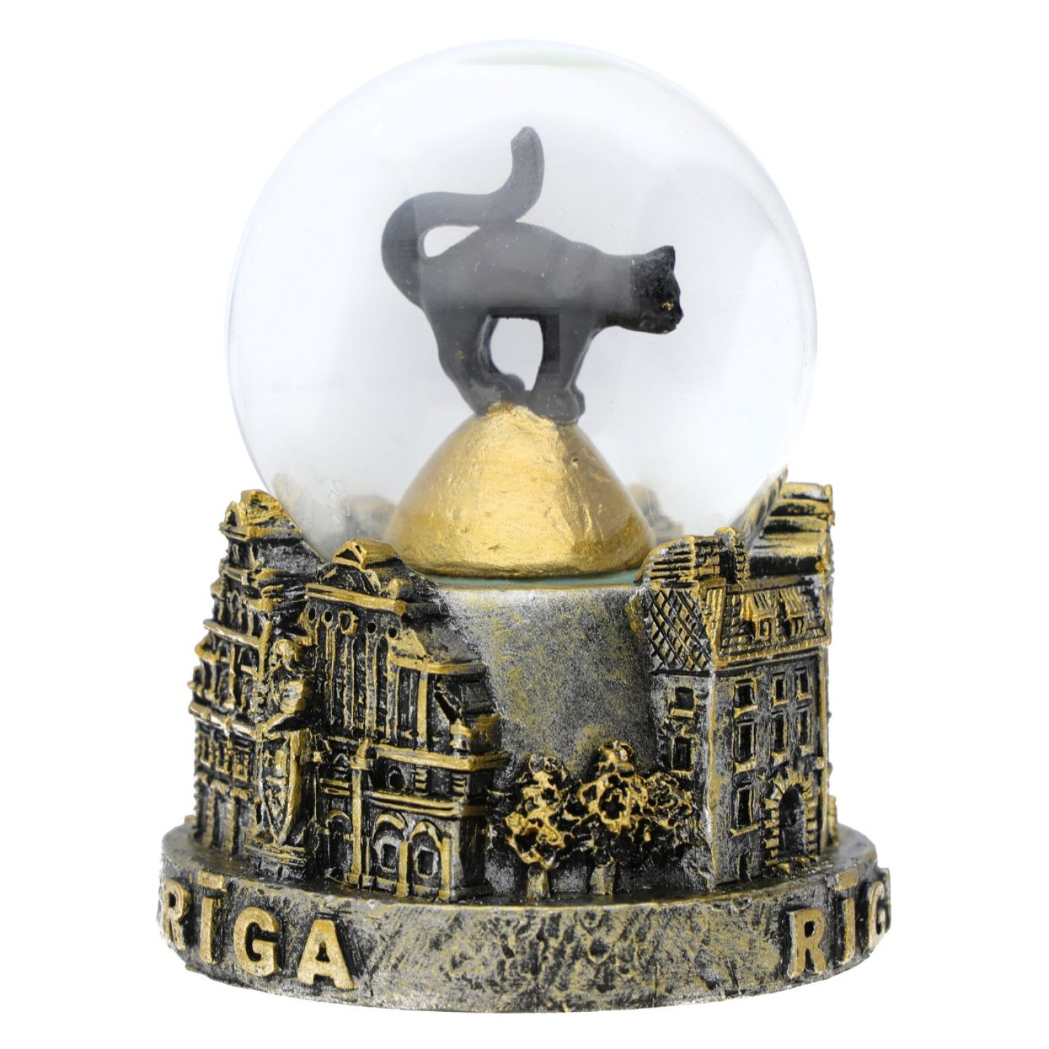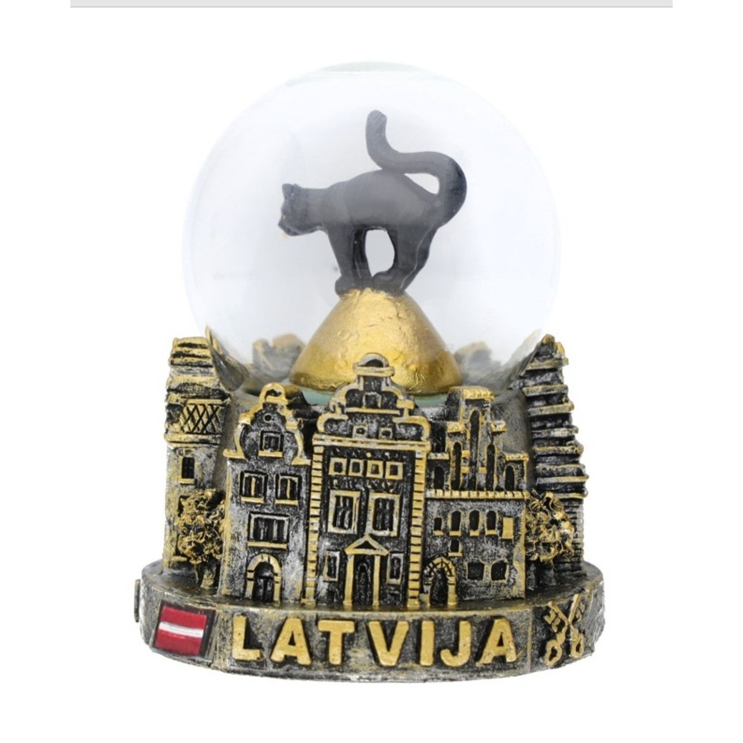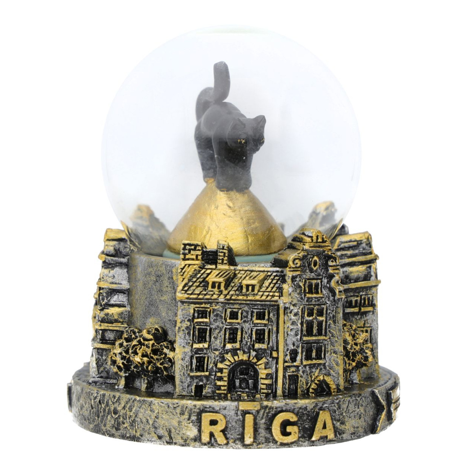 Dekoratīva sniega bumba ar melnu kaķi stikla kupolā. Pamatne rotāta ar Rīgas ievērojamākajiem objektiem sudraba un zelta krāsās. Lieliski piemērota suvenīru tirgotājiem un kolekcionāriem.