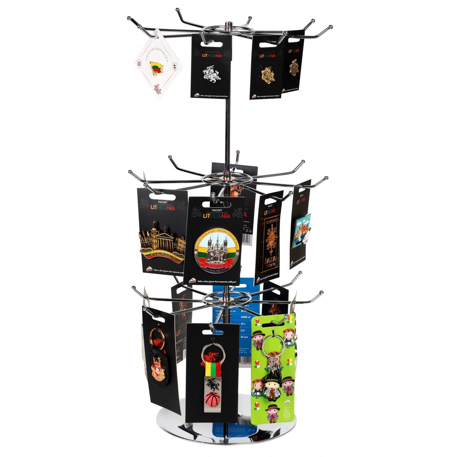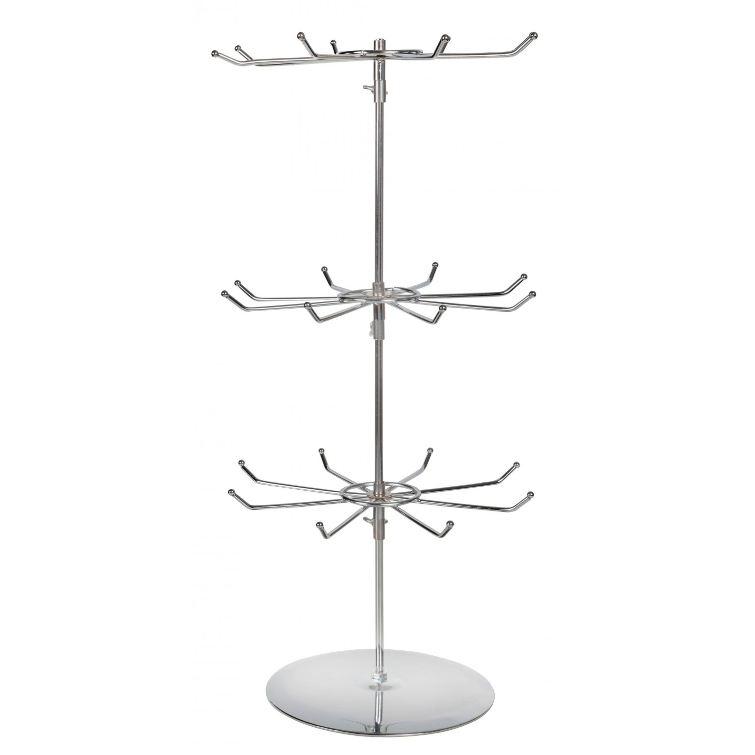Metāla stends ar trim regulējamiem līmeņiem un 24 āķiem. Ar stabilu pamatni. Ideāli piemērots atslēgu piekariņu, nozīmīšu un citu nelielu mazumtirdzniecības priekšmetu izvietošanai.