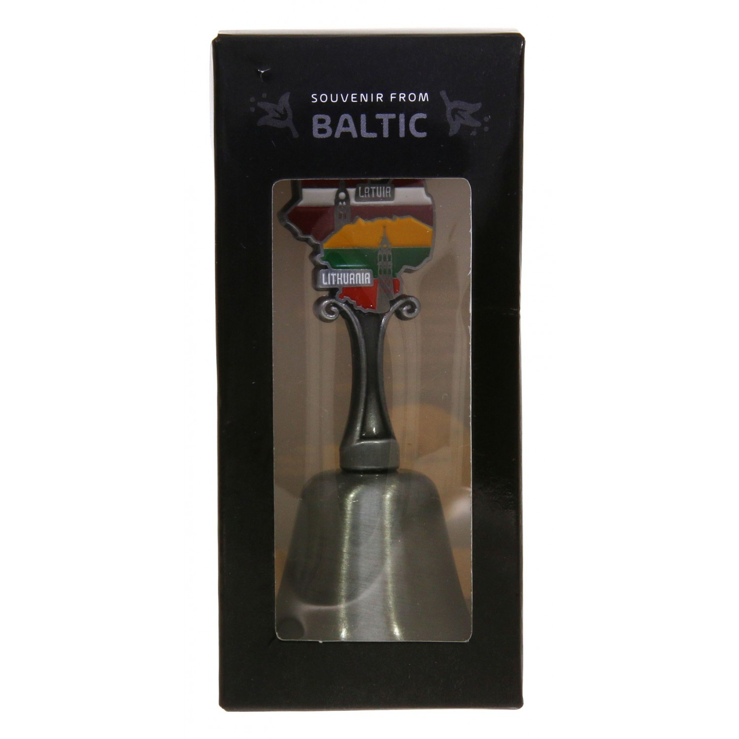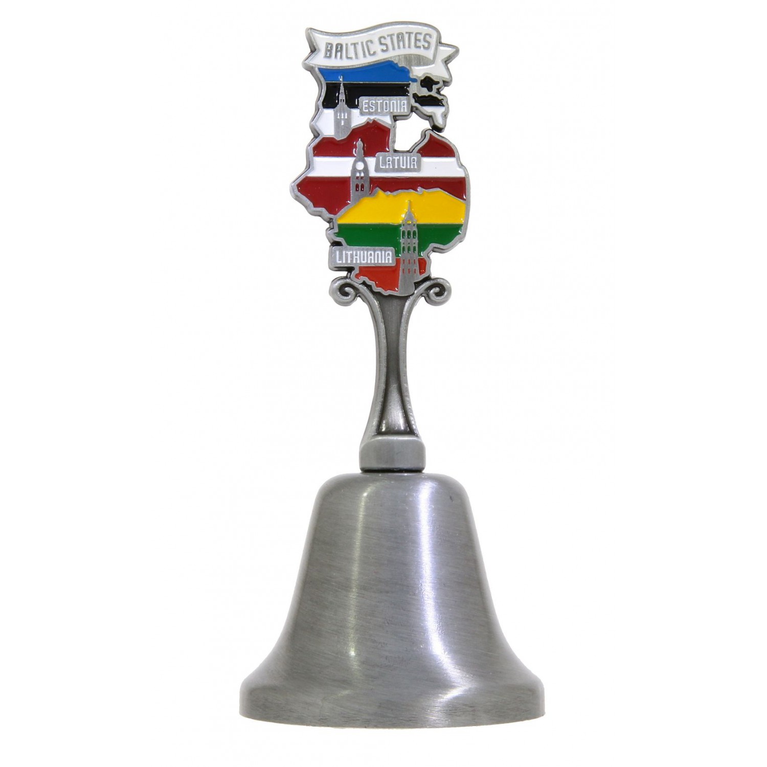 Metāla suvenīru zvaniņš dekorēts ar Baltijas valstu (Baltic States) kontūrām un to karogiem. Lielisks suvenīrs, kas simbolizē Lietuvu, Latviju un Igauniju.