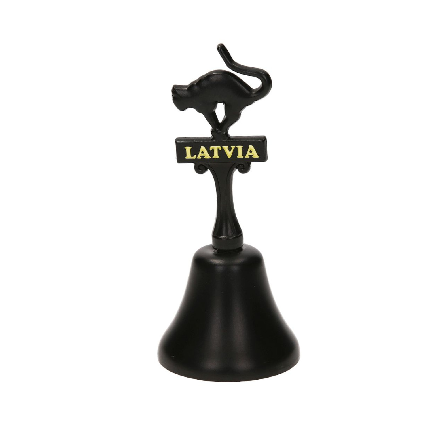 Dekoratīvs suvenīru zvans ar melnas kaķa figūru un uzrakstu Latvija. Piemērots suvenīru veikalu un tirgotāju piedāvājumam.