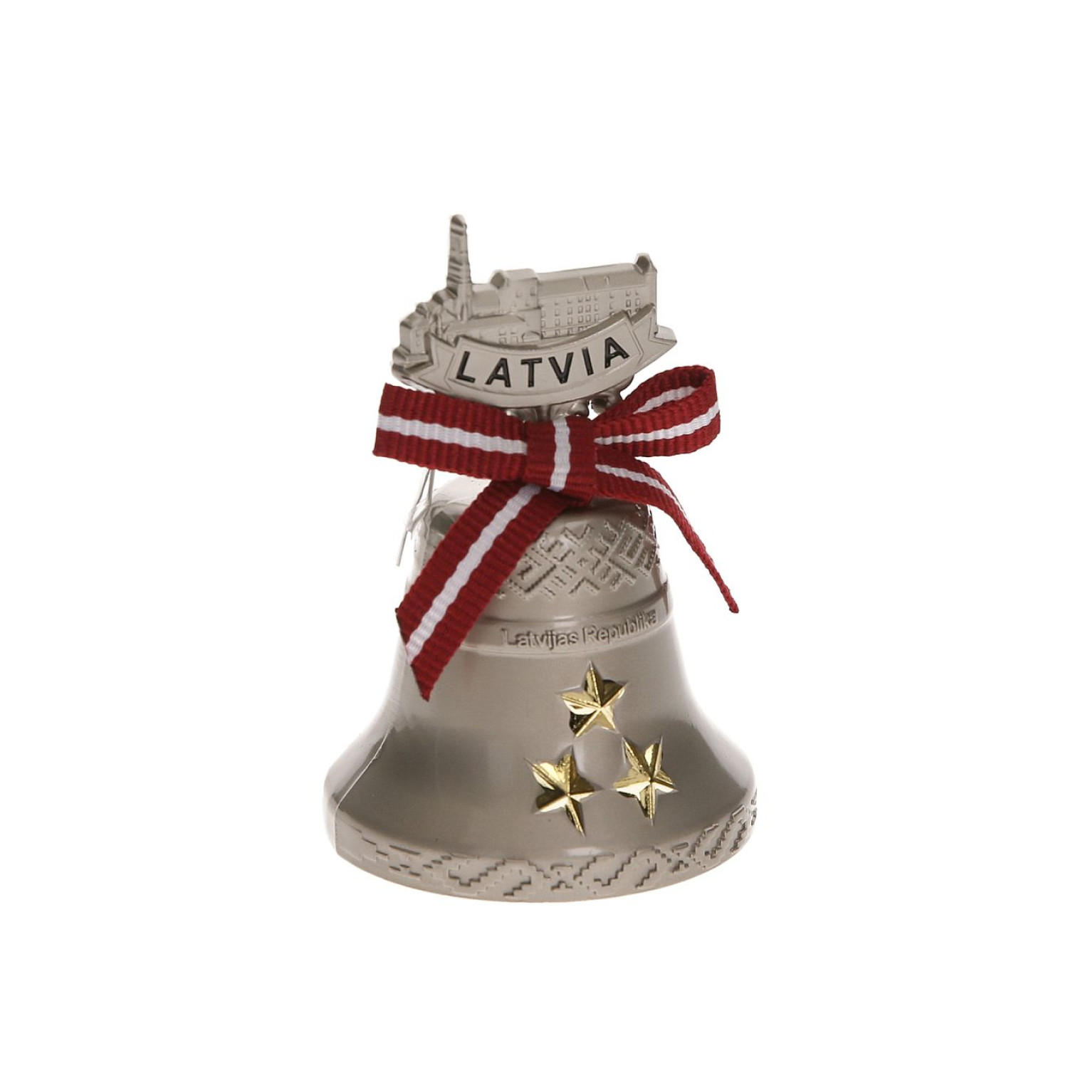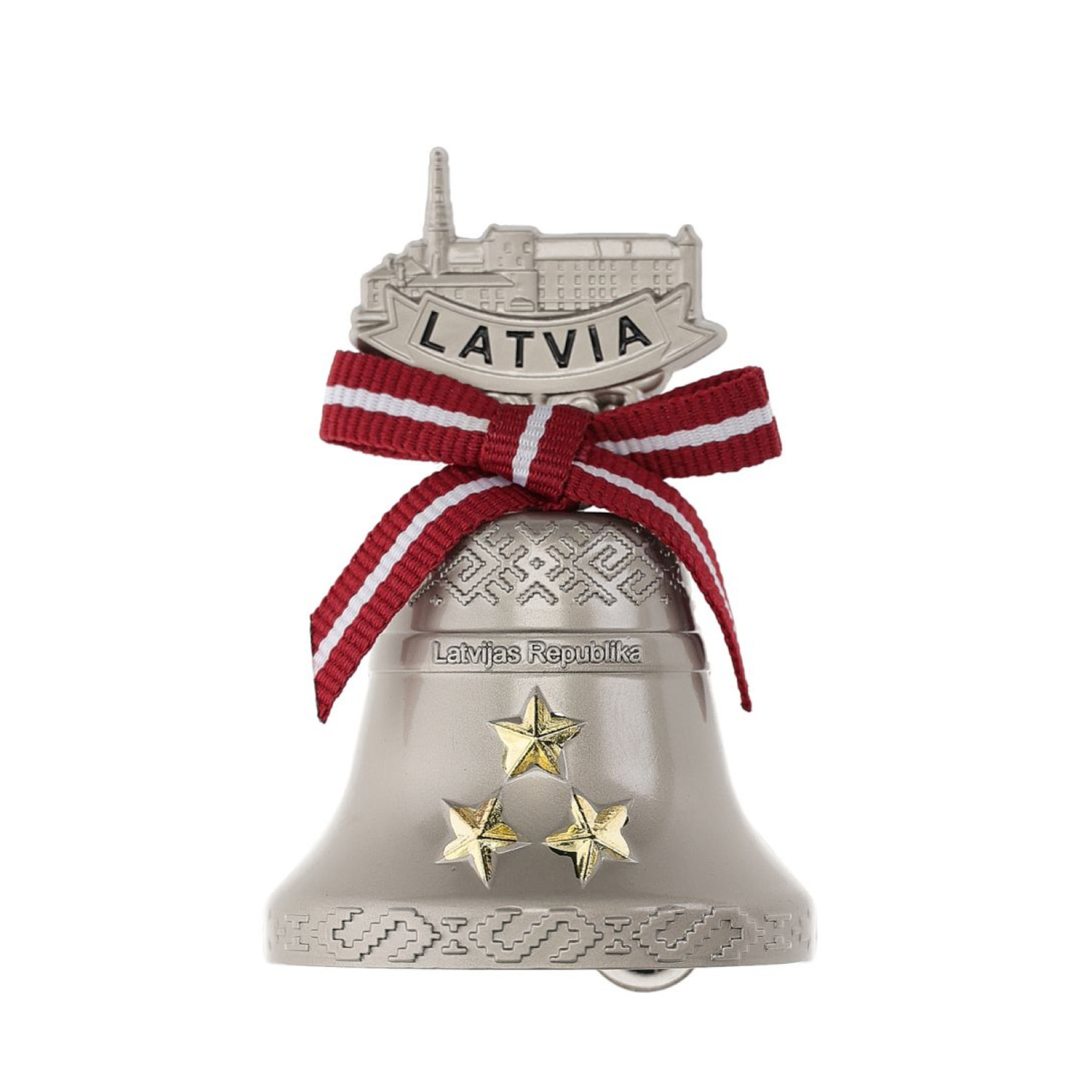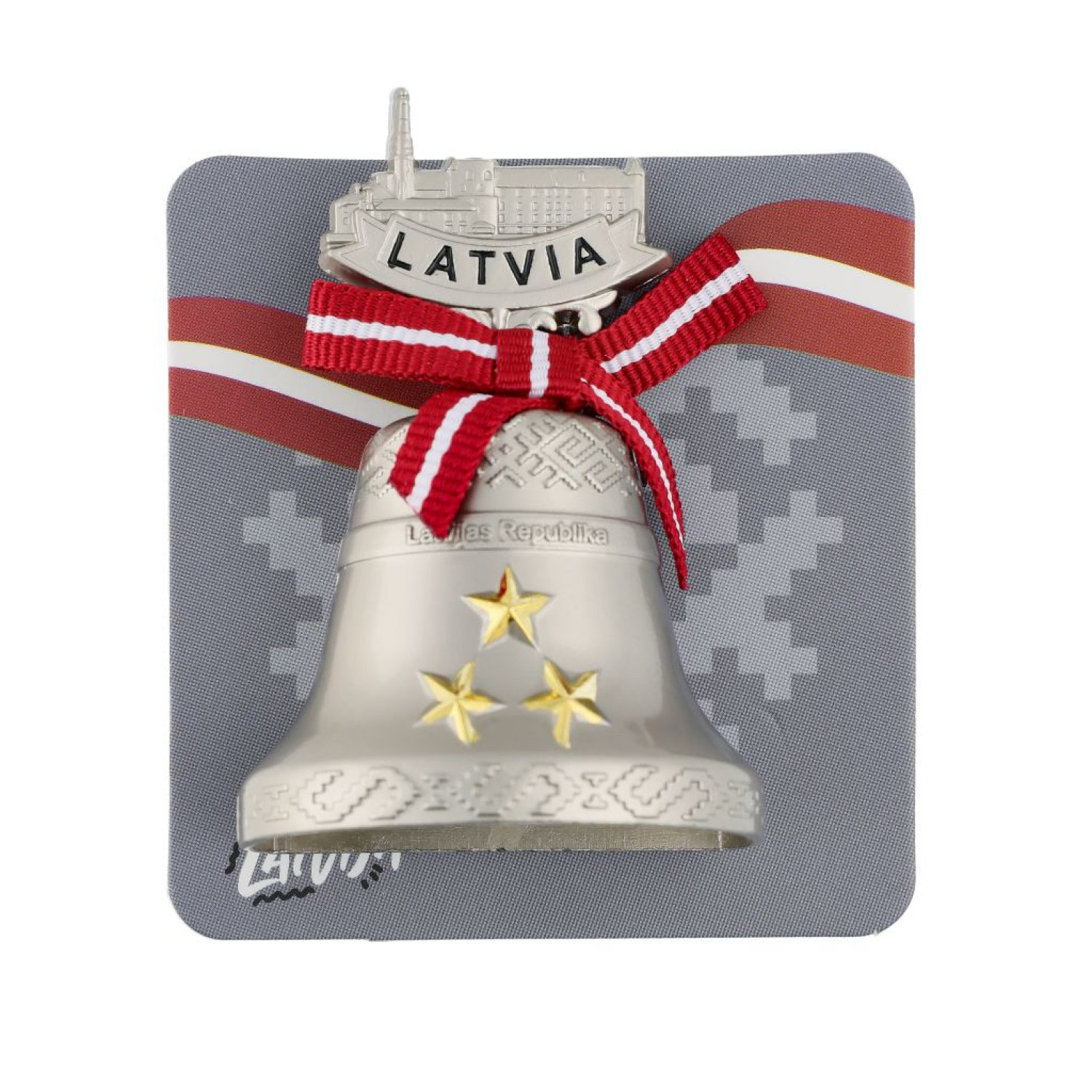 Zvaniņa formas ledusskapja magnēts ar trim zelta zvaigznēm, latviešu rakstiem un Latvijas kontūru ar uzrakstu Latvia. Rotāts ar lentīti Latvijas karoga krāsās. Stilīgs un simbolisks suvenīrs ar nacionālu raksturu.